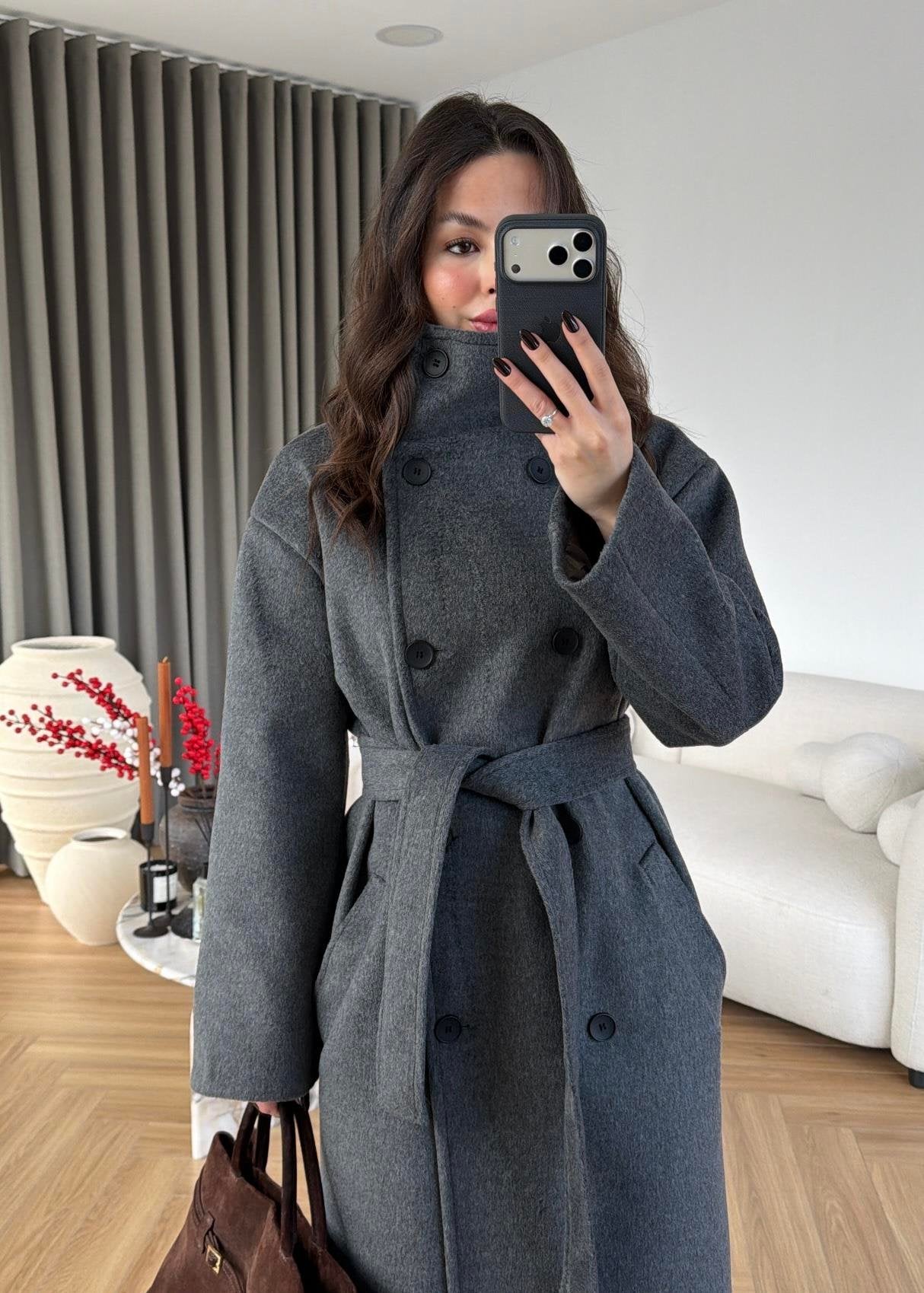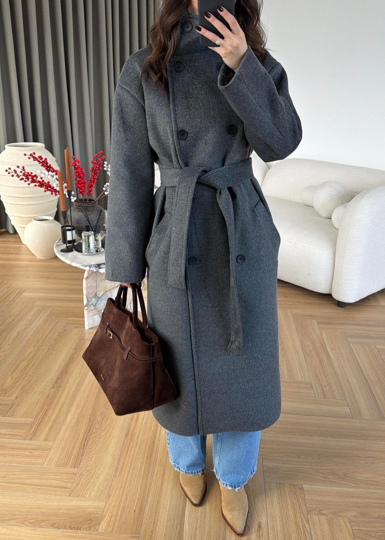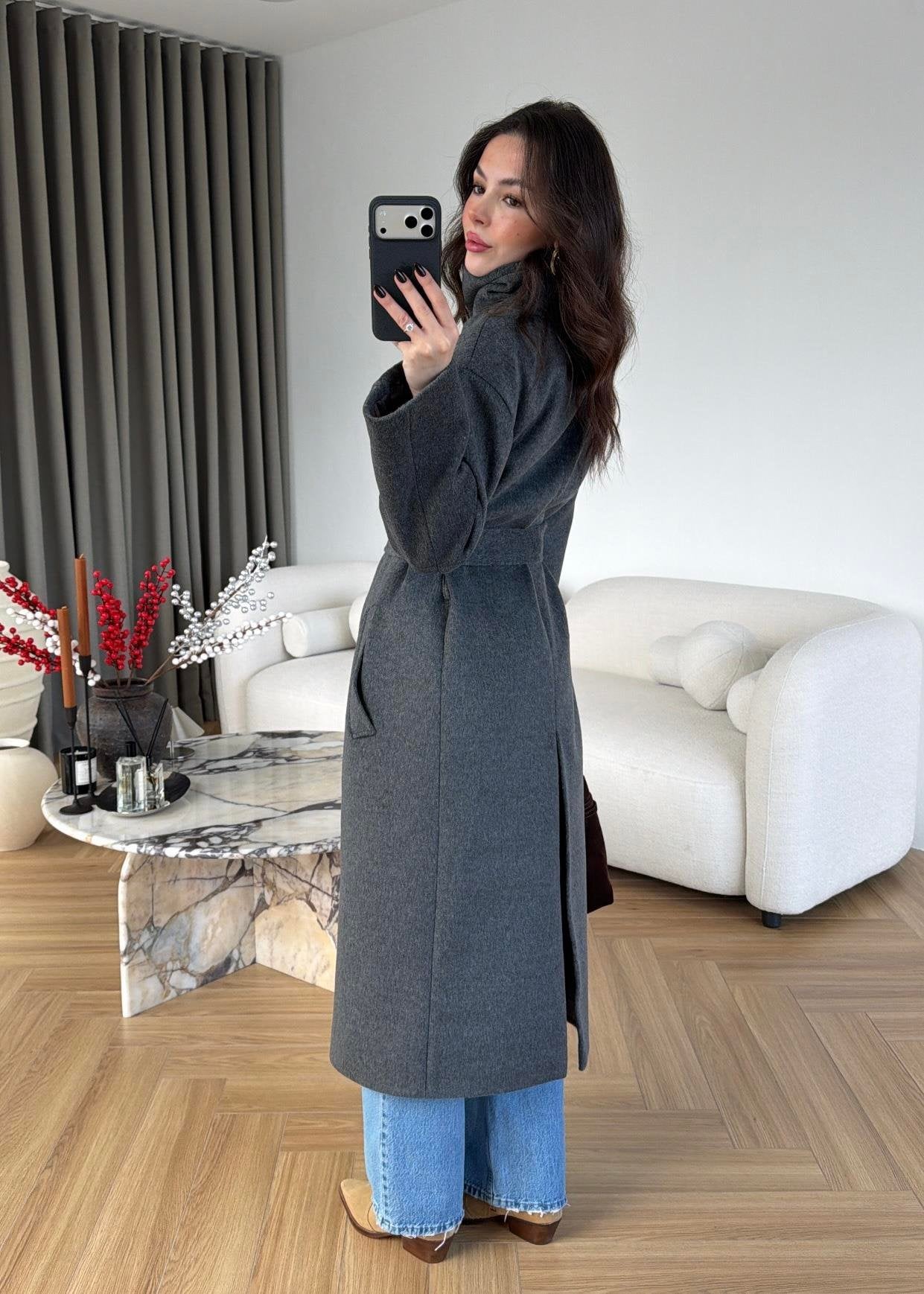 معطف صوف ناعم بياقة عالية باللون الرمادي الغامق