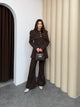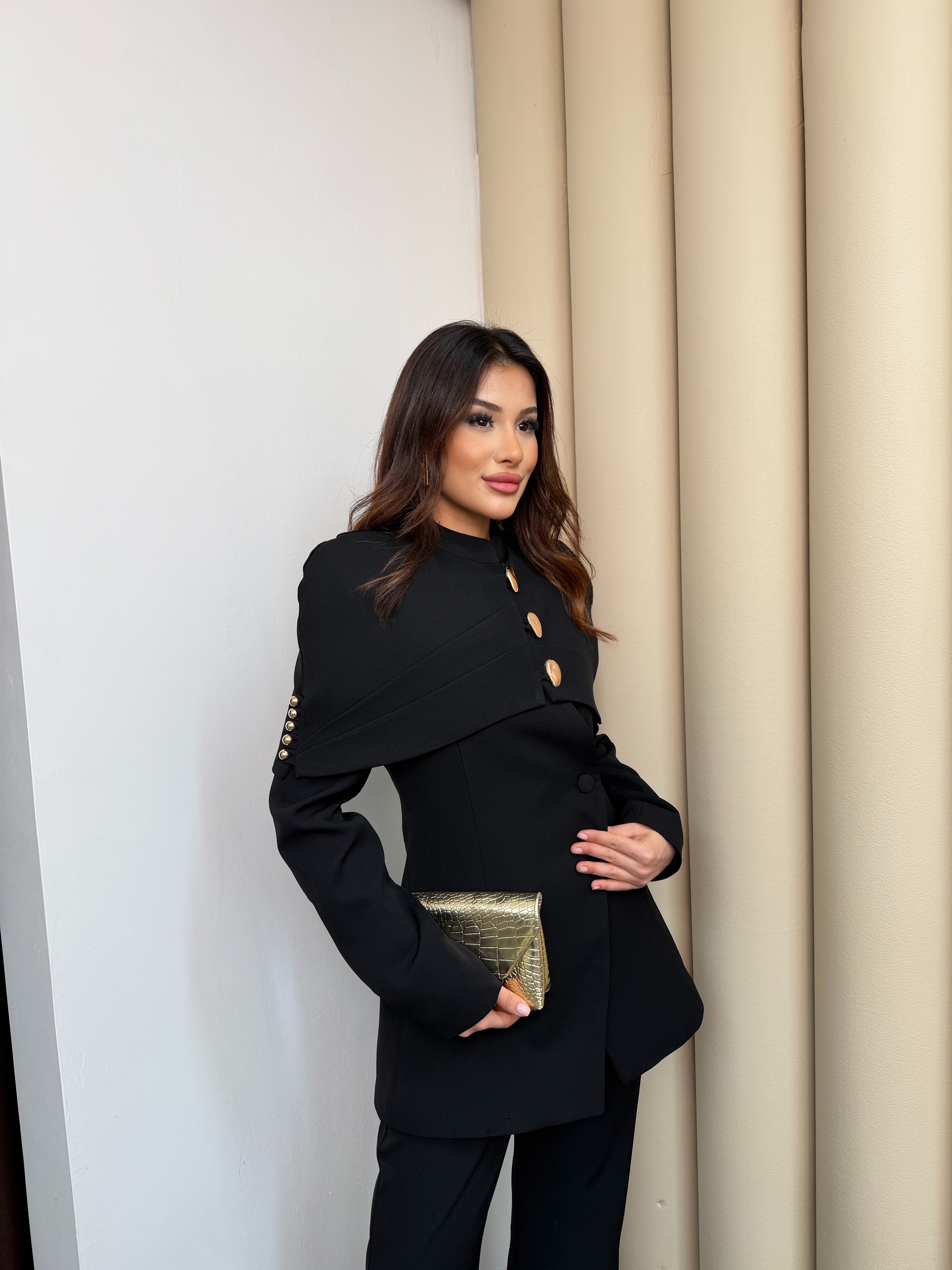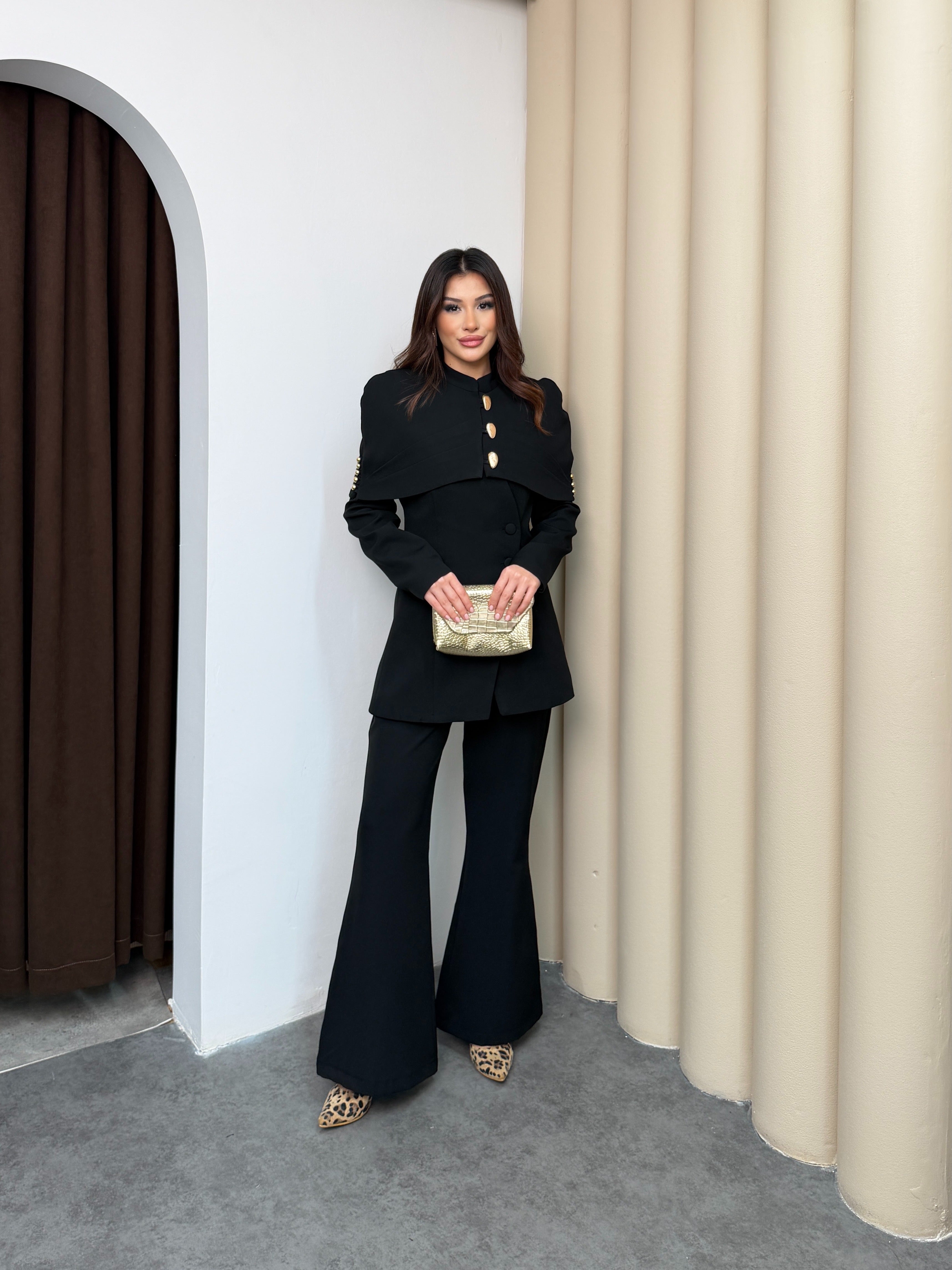 طقم نسائي أنيق يجمع بين الفخامة والبساطة في تصميم واحد. يتميّز بجاكيت قصير بقصّة عصرية مع أزرار معدنية مميّزة تضيف لمسة راقية على الإطلالة، وبنطال واسع بقصّة مريحة وأنيقة يناسب المناسبات الرسمية والسهرات الراقية.