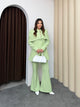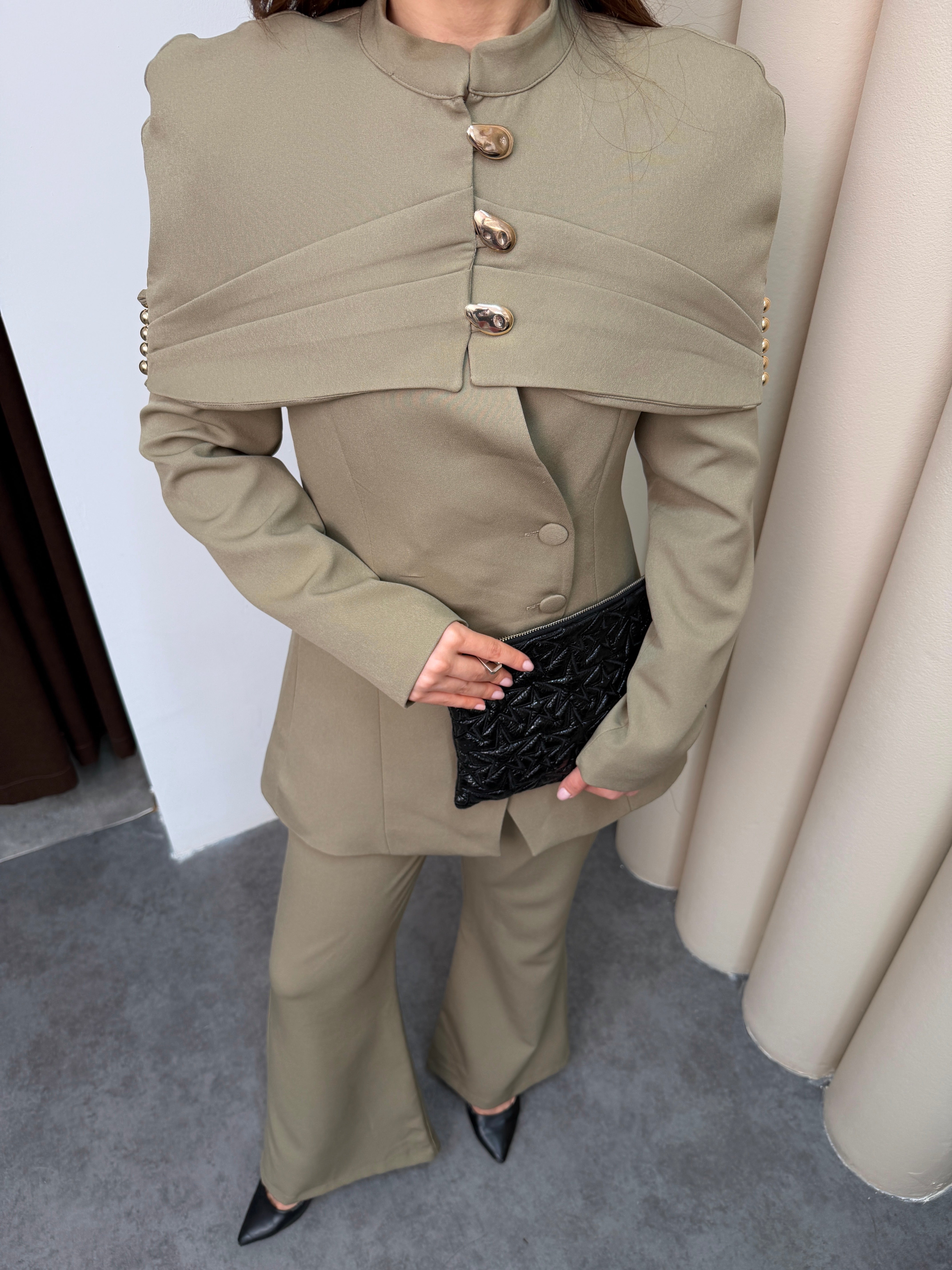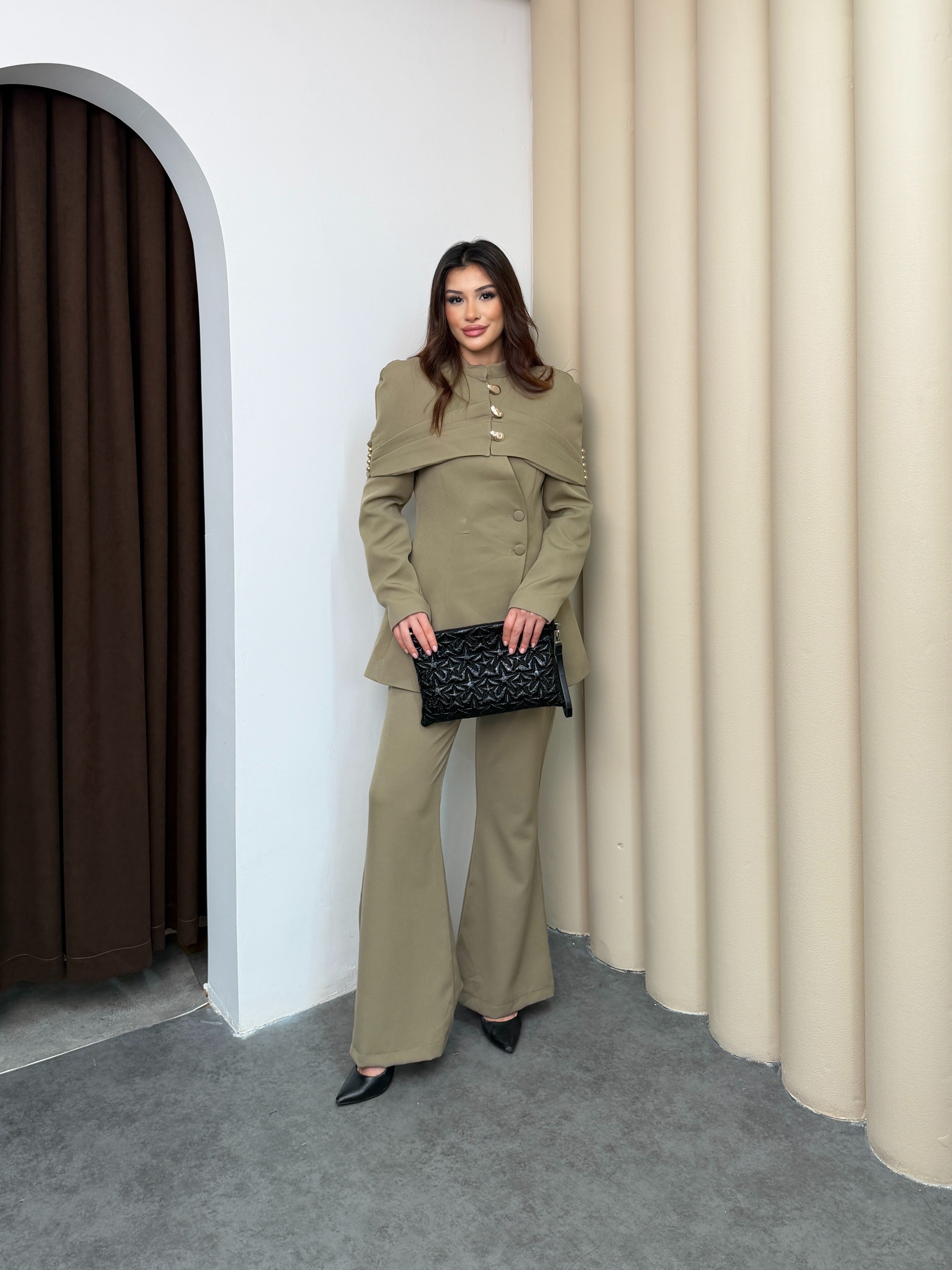 طقم نسائي أنيق يجمع بين الفخامة والبساطة في تصميم واحد. يتميّز بجاكيت قصير بقصّة عصرية مع أزرار معدنية مميّزة تضيف لمسة راقية على الإطلالة، وبنطال واسع بقصّة مريحة وأنيقة يناسب المناسبات الرسمية والسهرات الراقية.