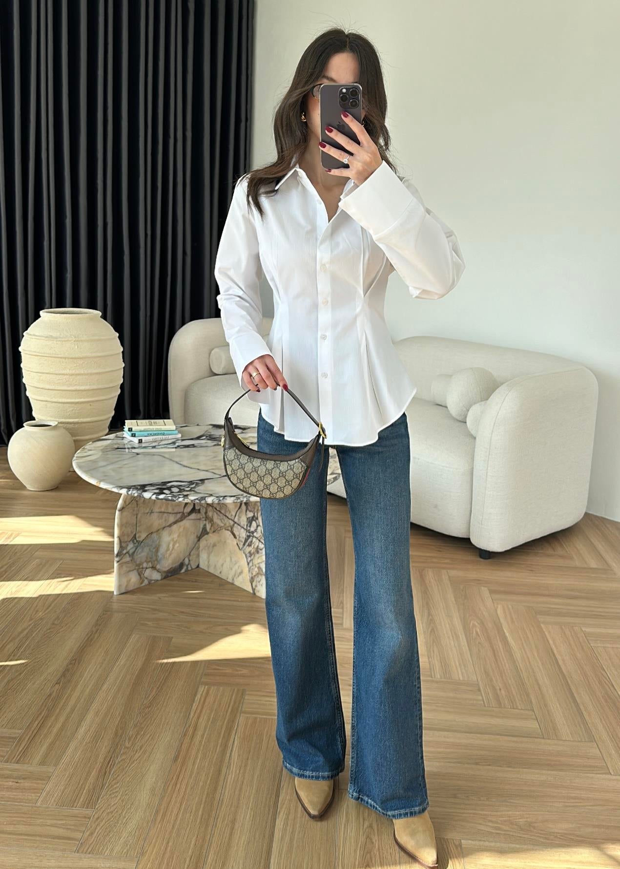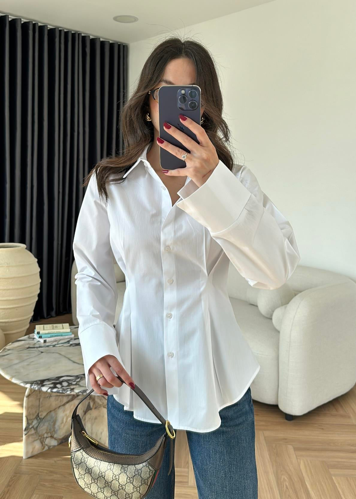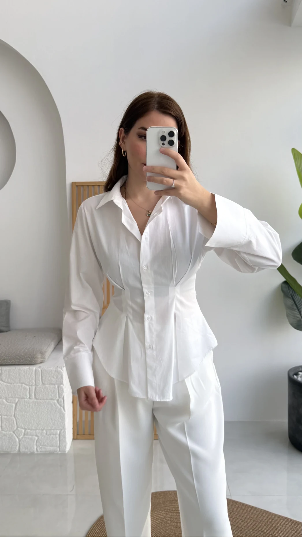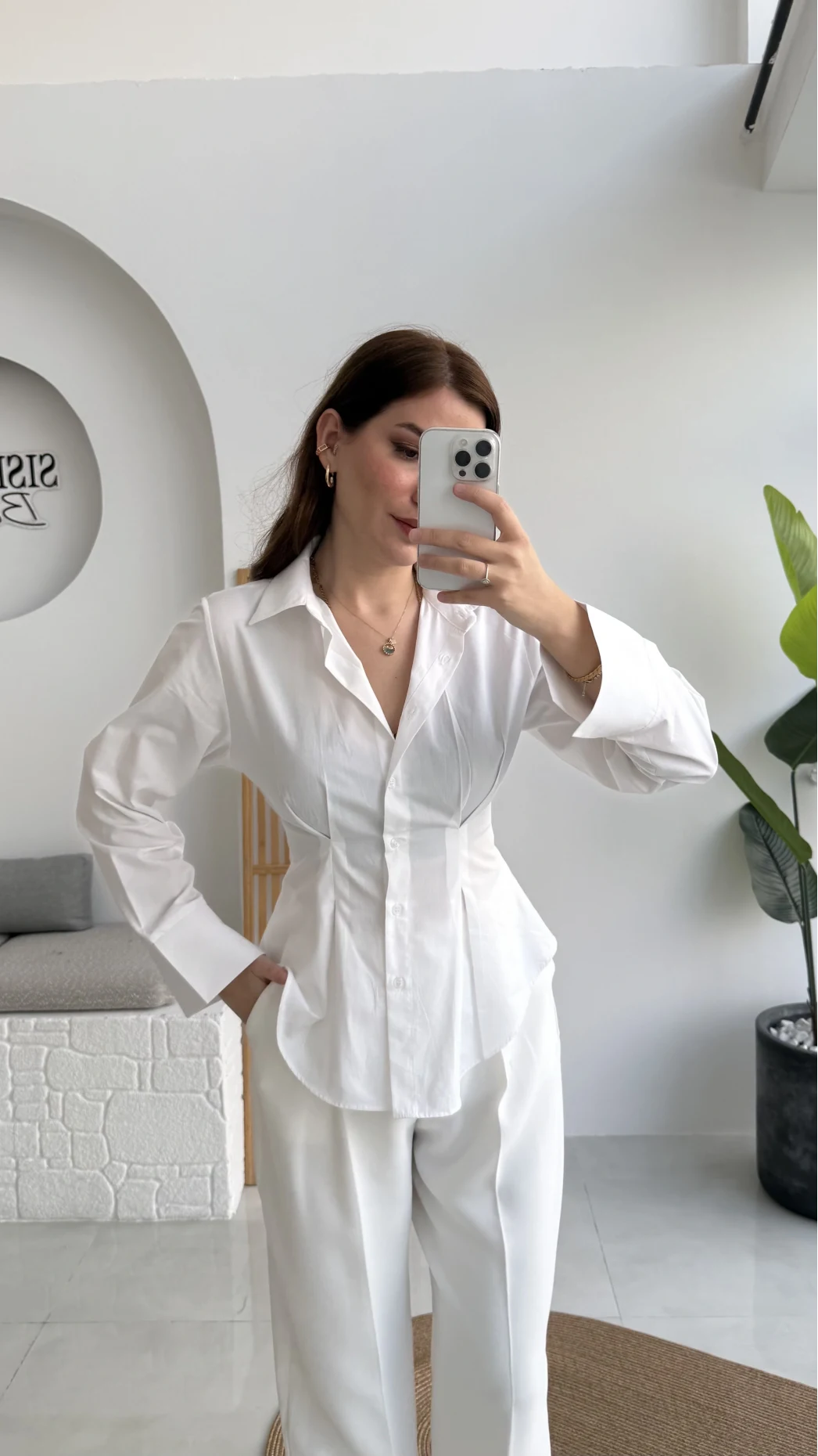 قميص أنيق مصنوع بقصة دقيقة تُبرز الخصر بأسلوب راقٍ، مع أزرار أمامية كلاسيكية وياقة رسمية تضيف لمسة فخامة. يتميز بتفاصيل قصّات جانبية تمنح شكلاً أنثوياً جذاباً دون المساس بالراحة. الأكمام الطويلة بقصّة واسعة خفيفة تضيف توازناً مثالياً للتصميم