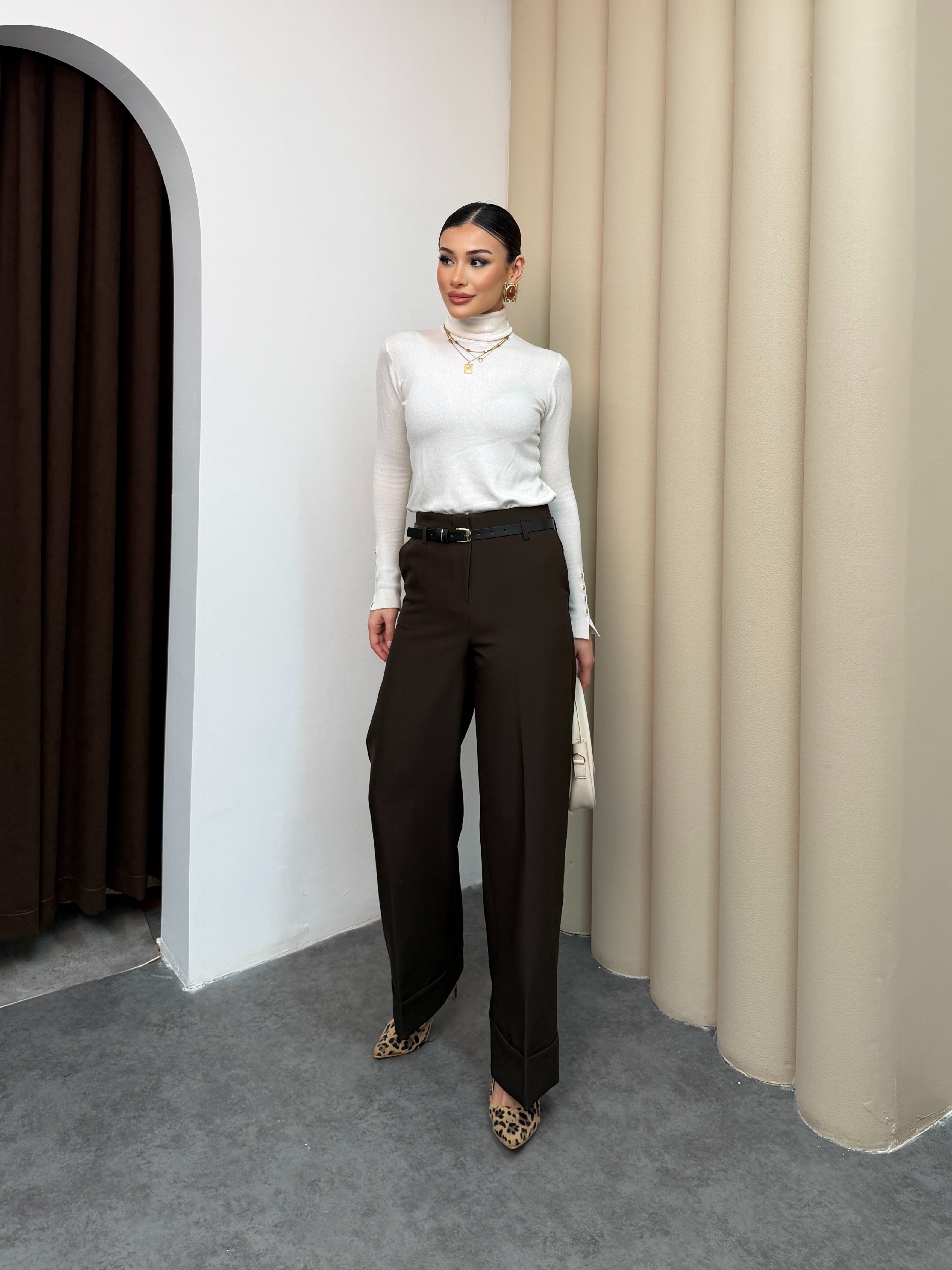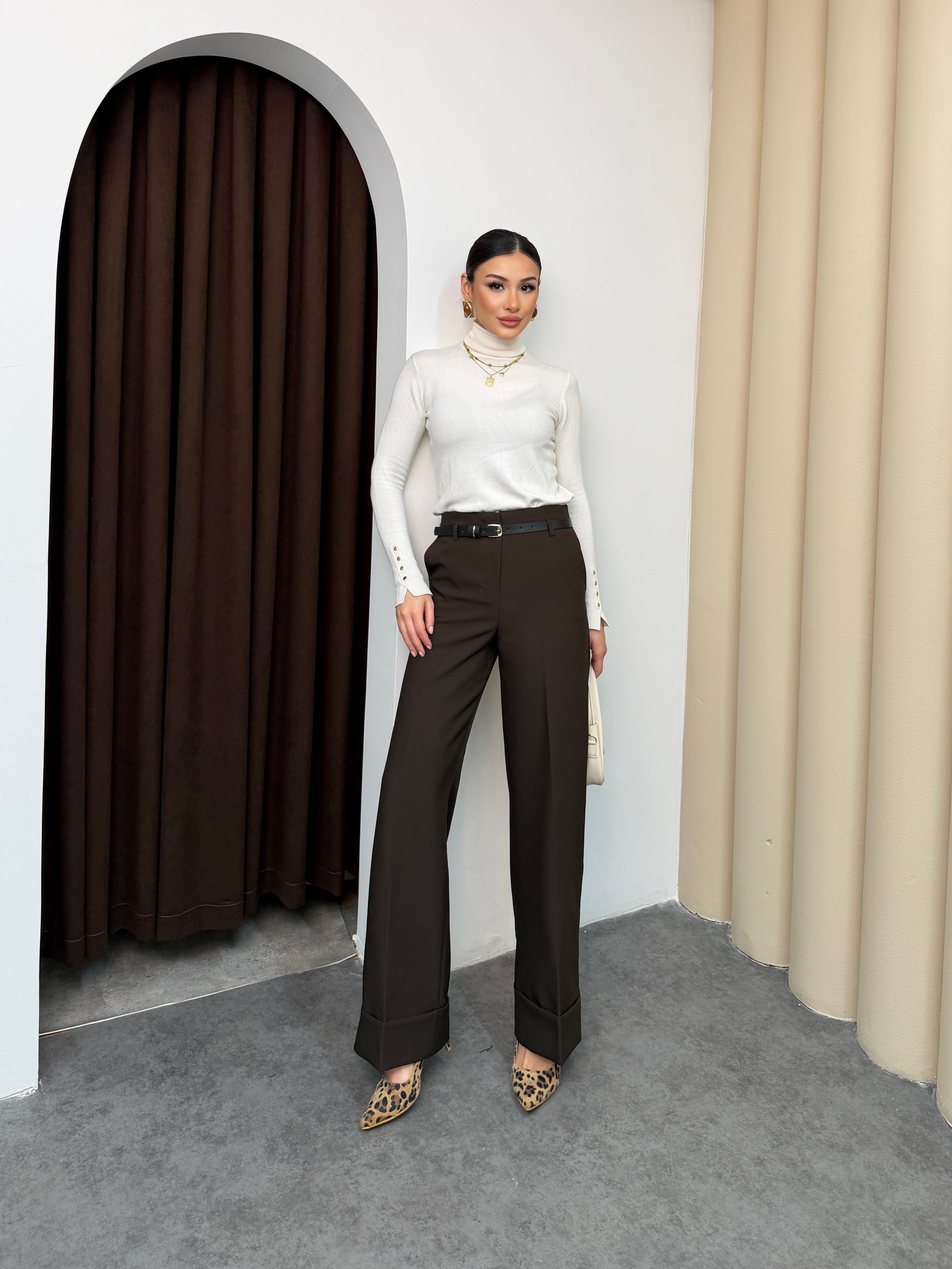 بنطلون عريض قماش مع قشاط