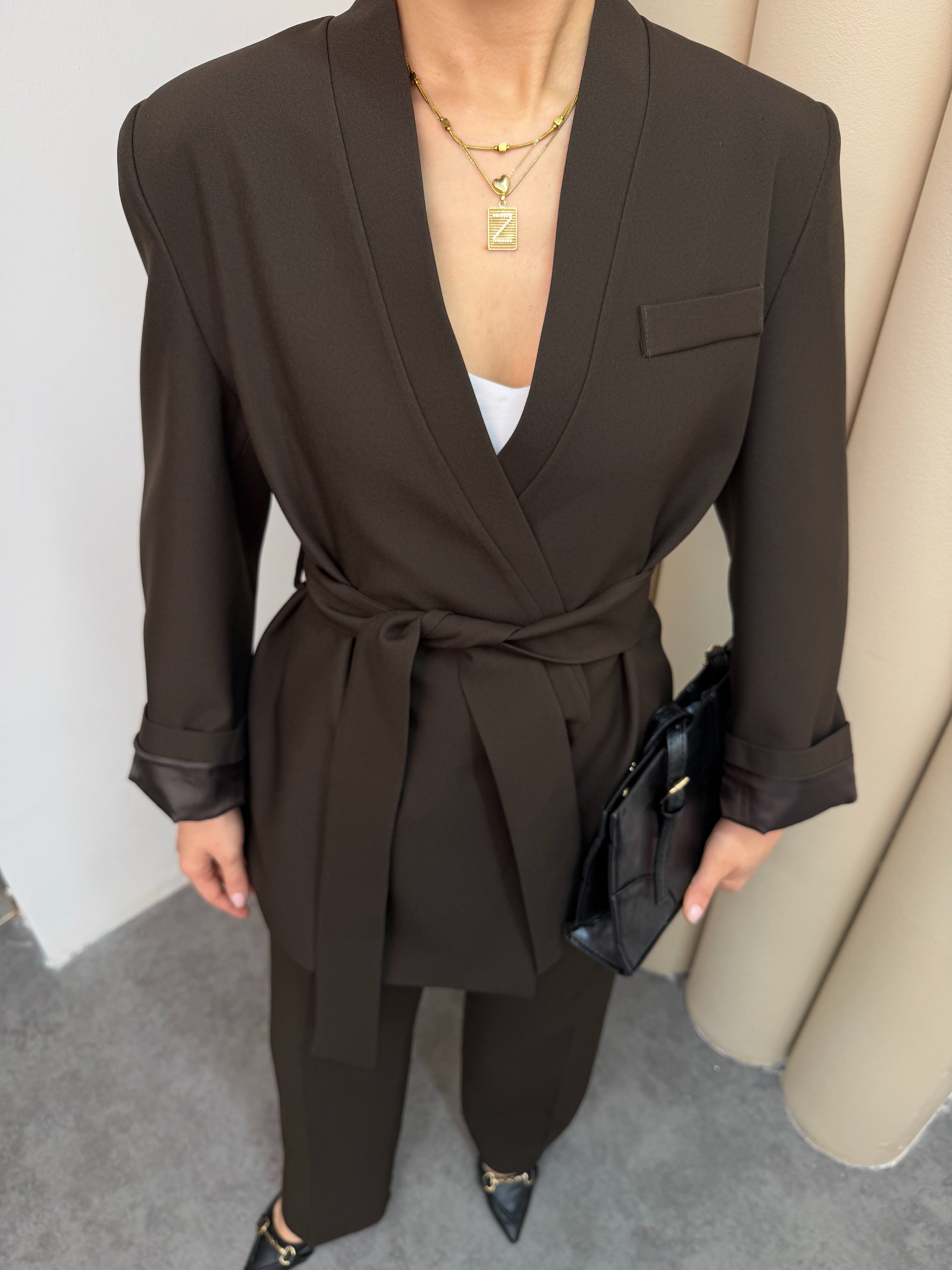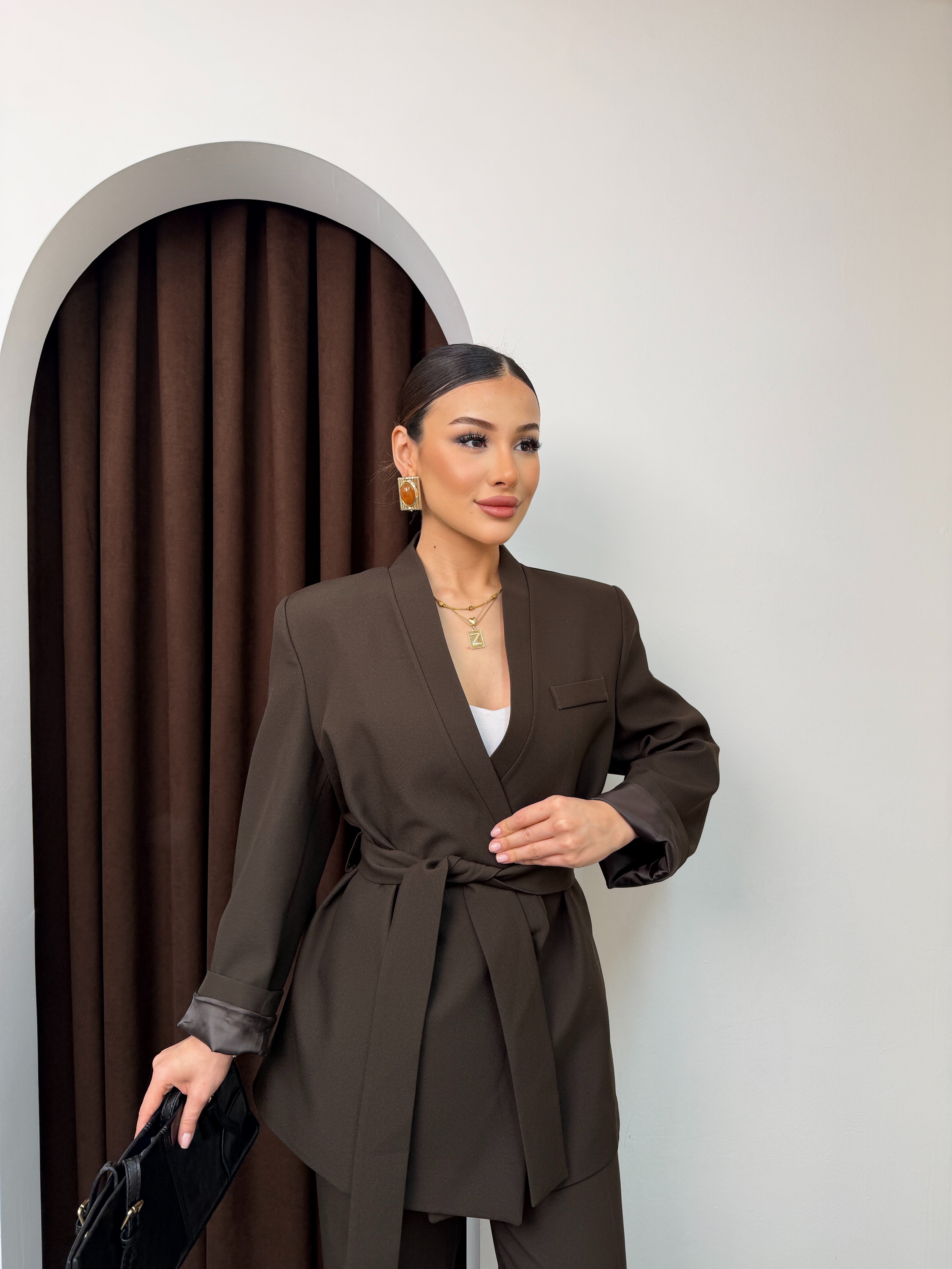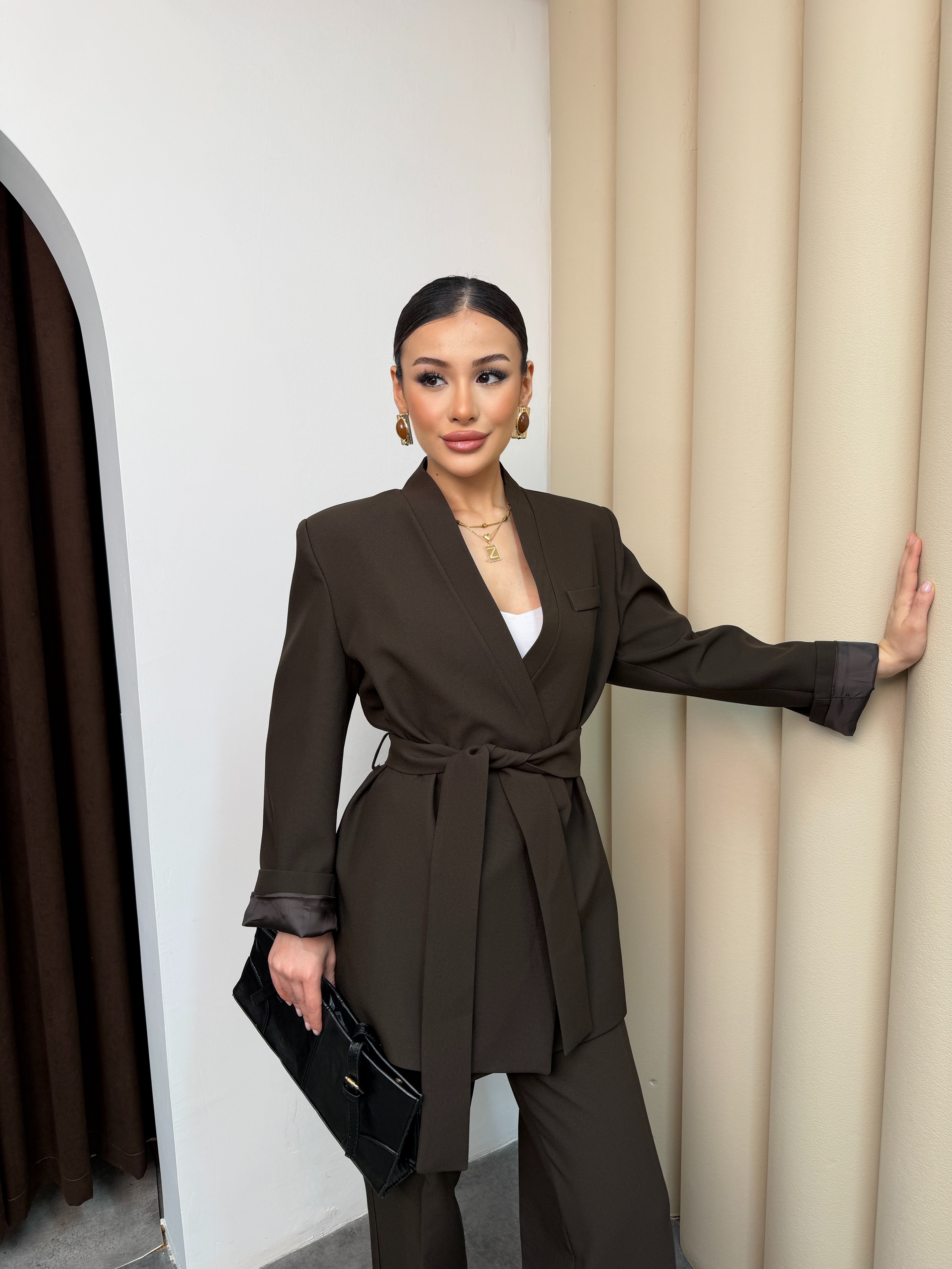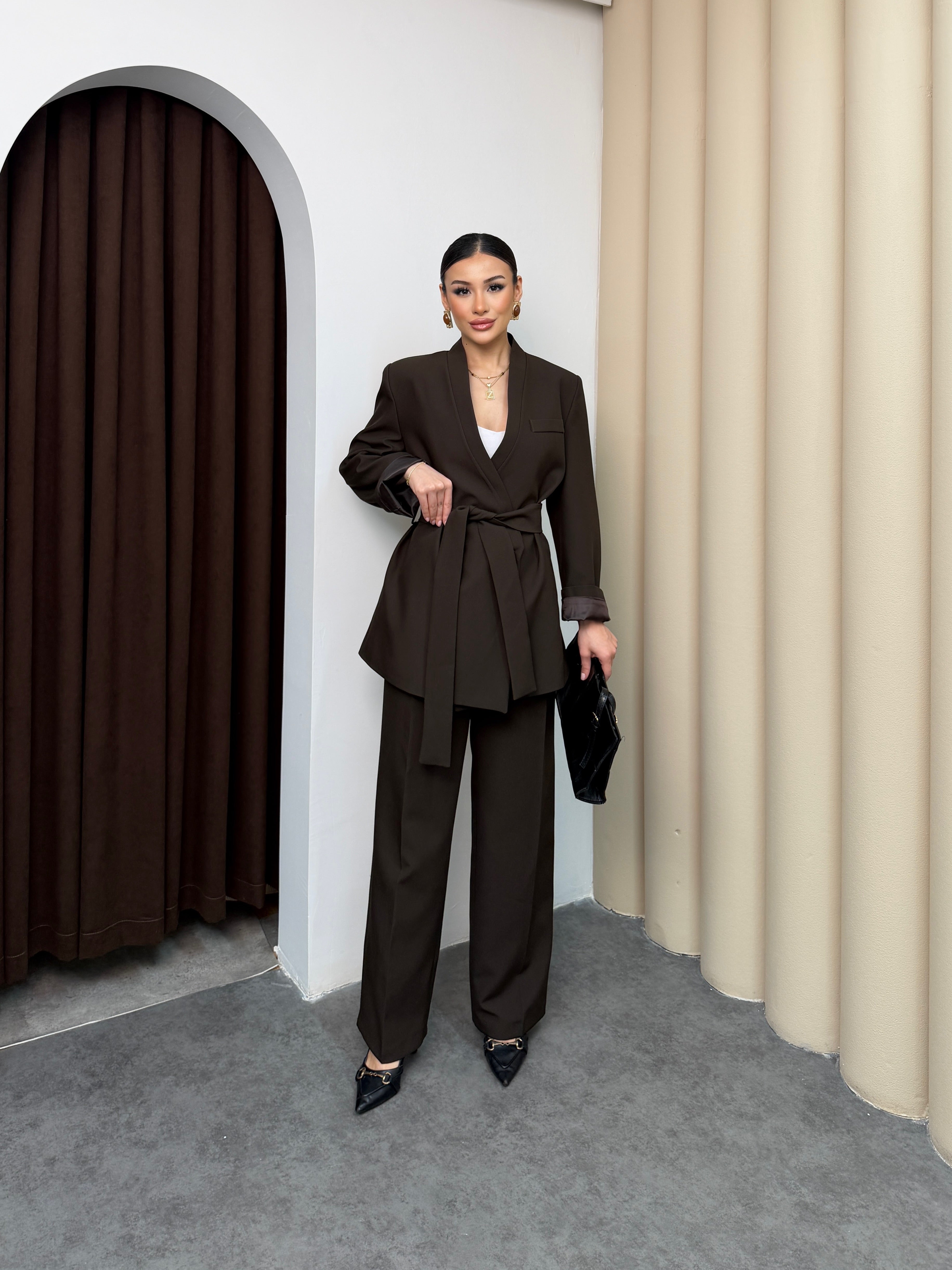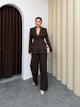 طقم نسائي أنيق يجمع بين الفخامة والبساطة في تصميم واحد. يتميّز بجاكيت قصير بقصّة عصرية مع أزرار معدنية مميّزة تضيف لمسة راقية على الإطلالة، وبنطال واسع بقصّة مريحة وأنيقة يناسب المناسبات الرسمية والسهرات الراقية.