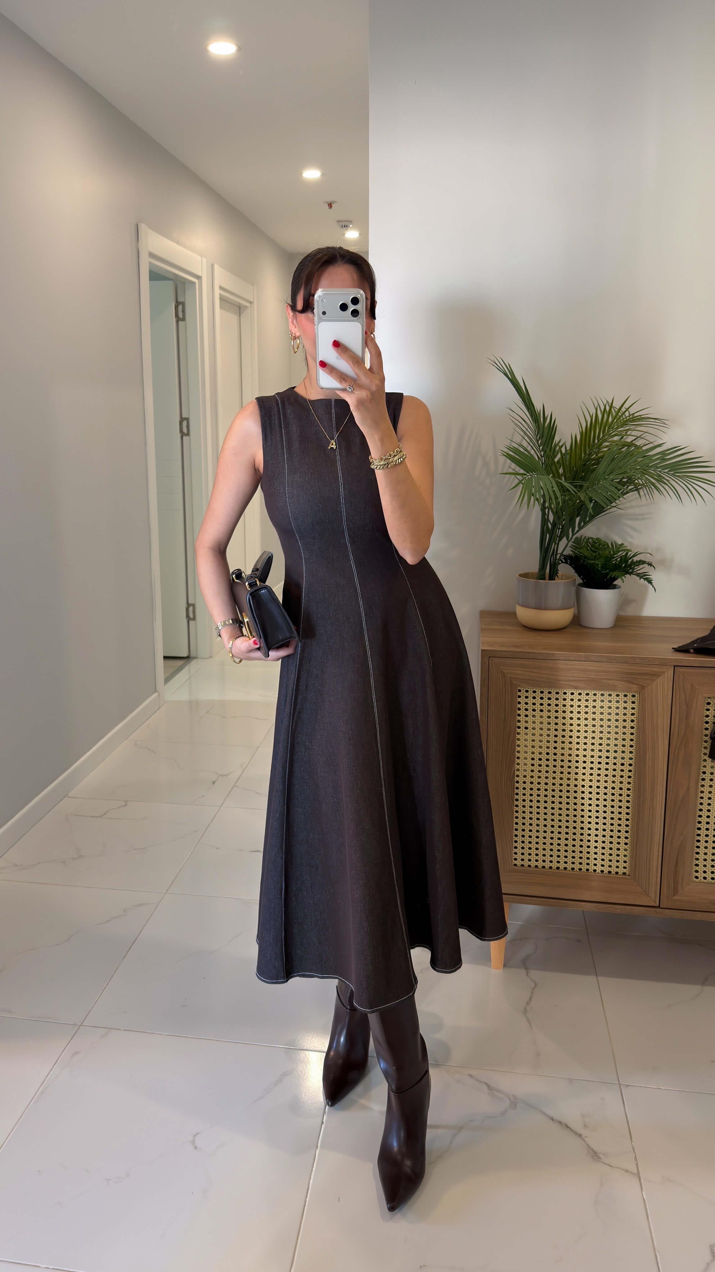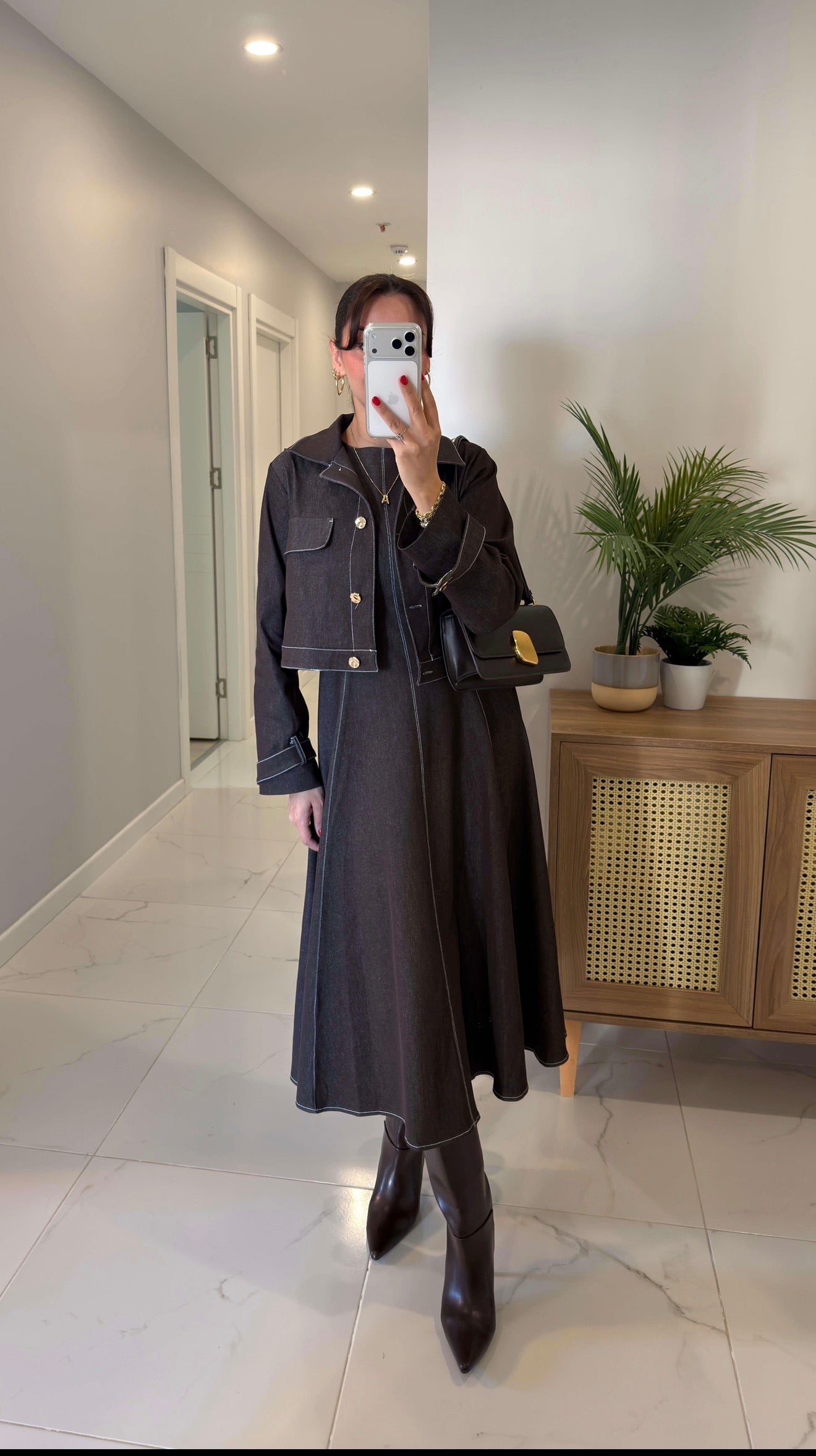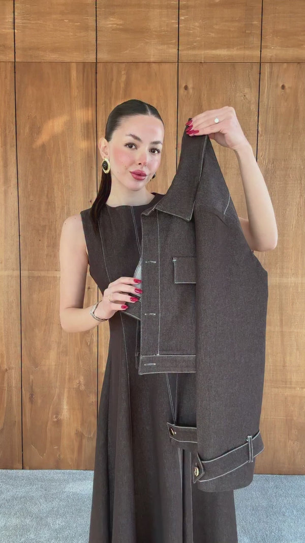 طقم فستان جينز مع جكيت بني