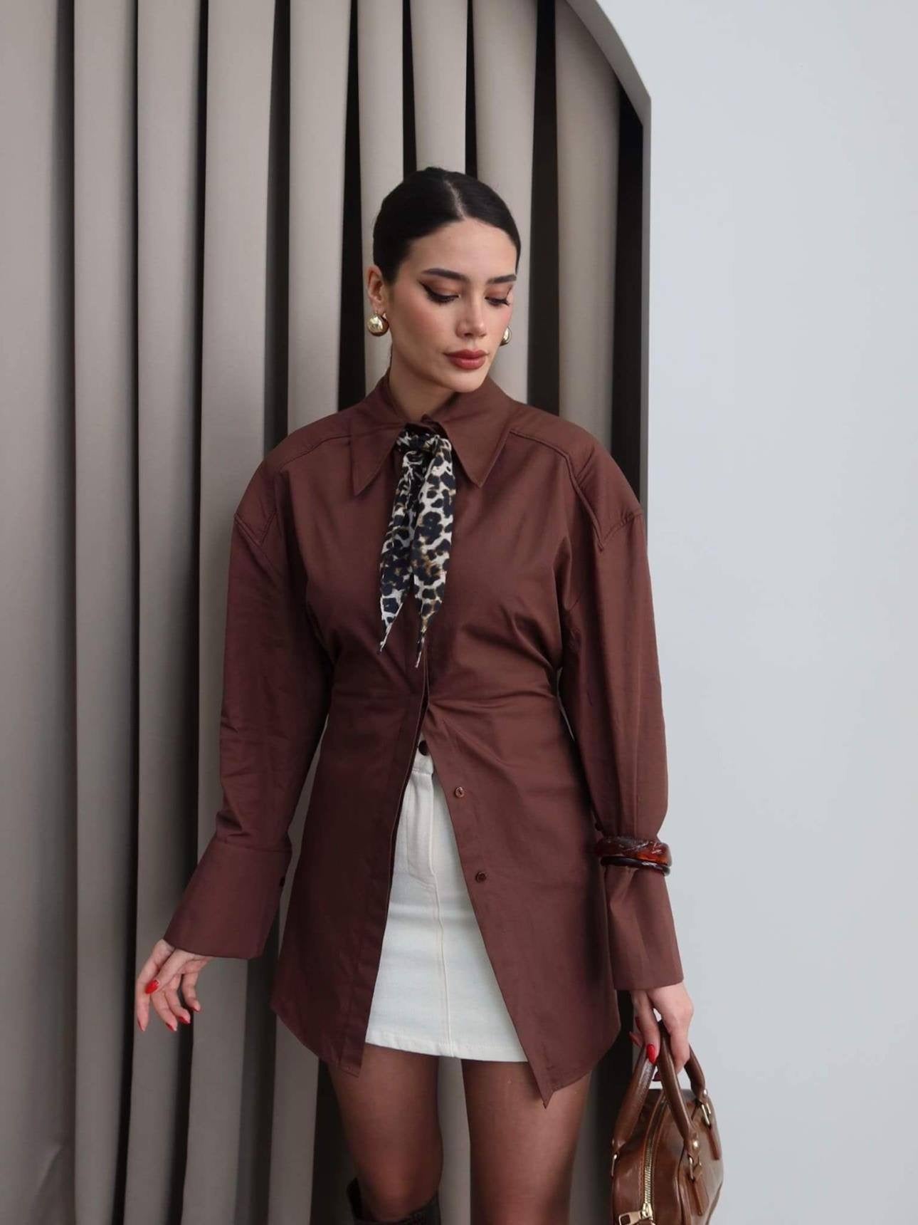 قميص أنيق مصنوع بقصة دقيقة تُبرز الخصر بأسلوب راقٍ، مع أزرار أمامية كلاسيكية وياقة رسمية تضيف لمسة فخامة. يتميز بتفاصيل قصّات جانبية تمنح شكلاً أنثوياً جذاباً دون المساس بالراحة. الأكمام الطويلة بقصّة واسعة خفيفة تضيف توازناً مثالياً للتصميم