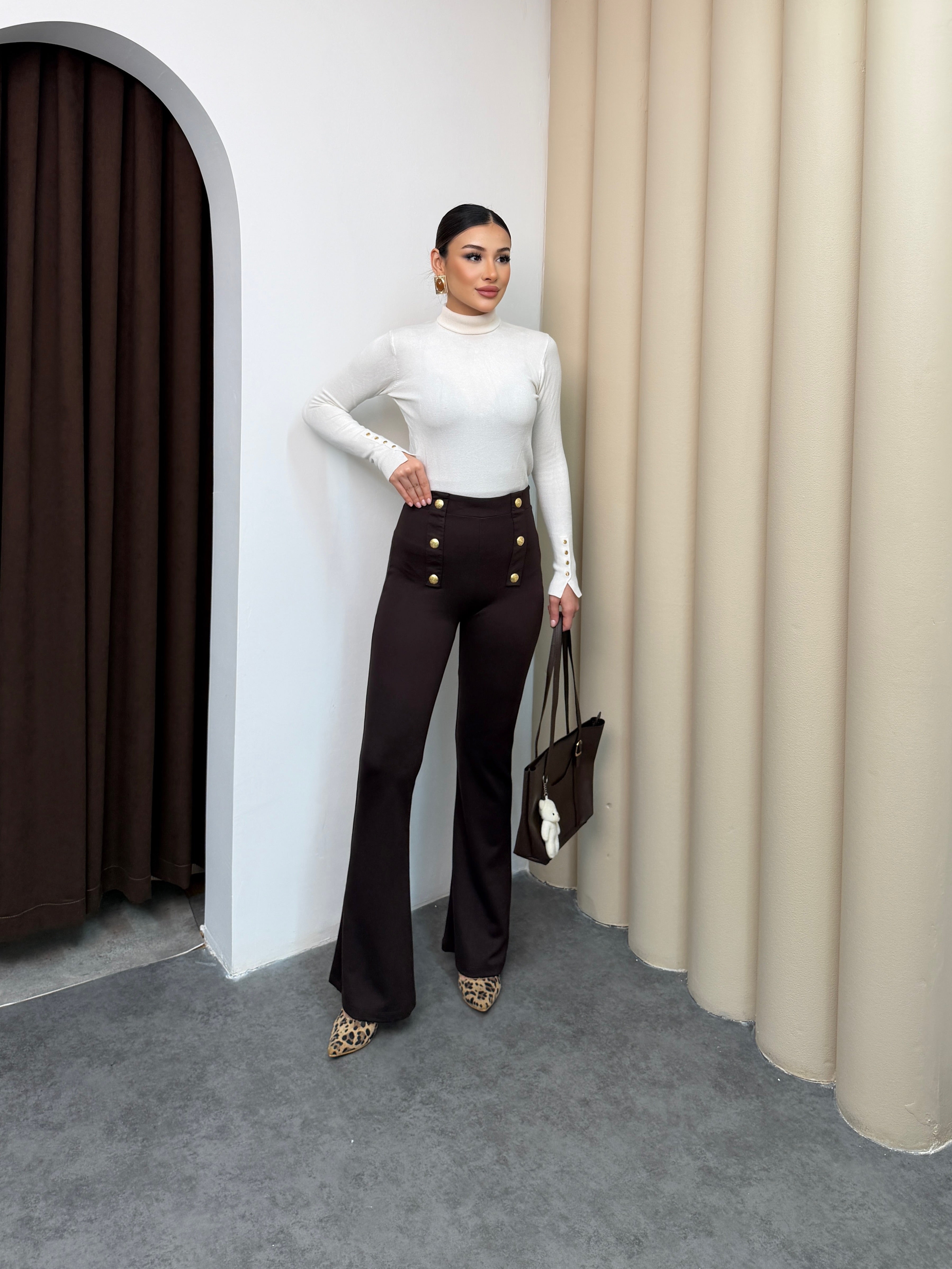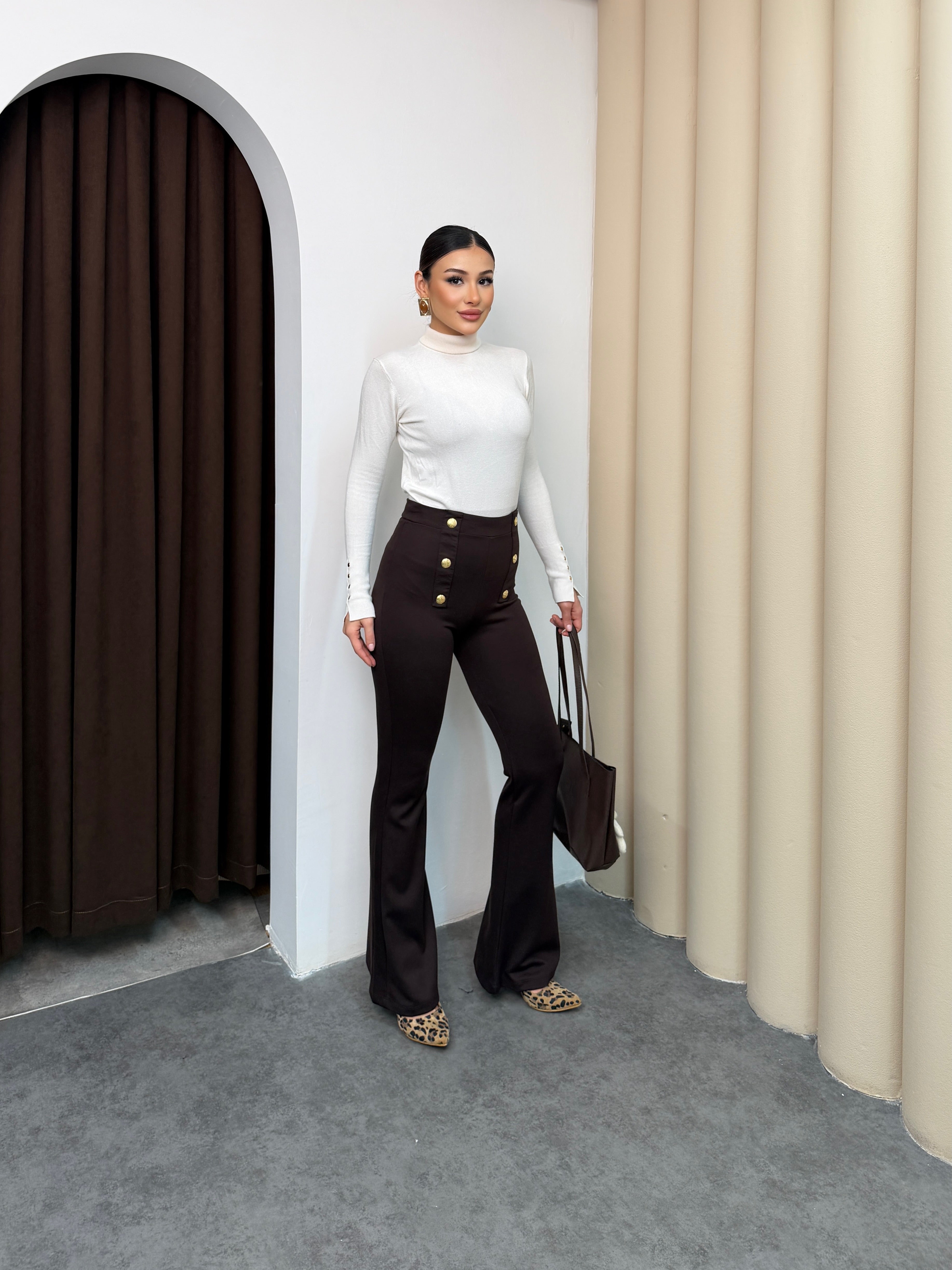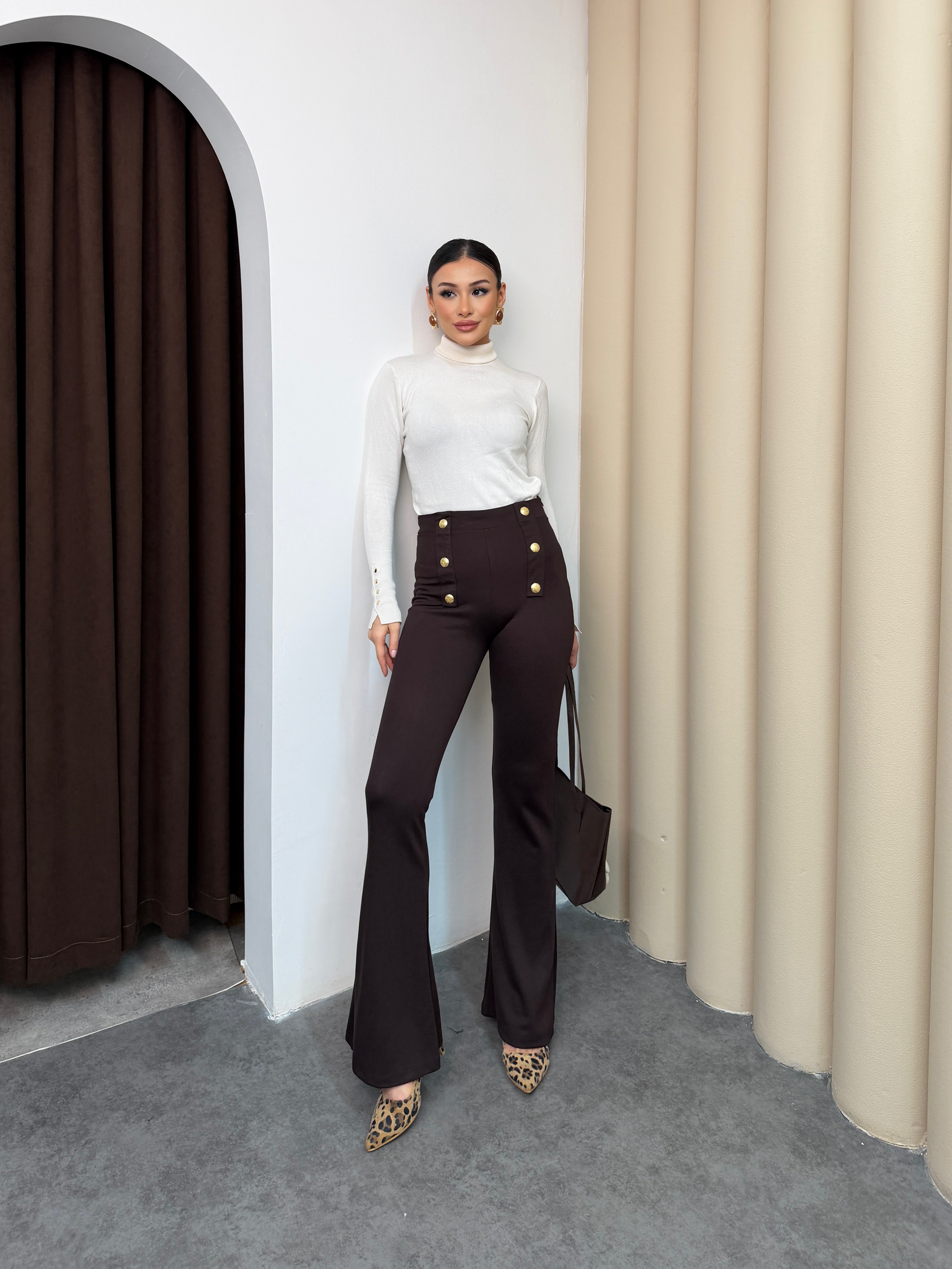 بنطلون قماش عالي الخصر بتصميم أنيق وعملي. يتميّز بقصّة مستقيمة مائلة للـ Flare من الأسفل (اتساع خفيف عند القدم)، مع تفاصيل أزرار ديكورية على الجانبين من الأمام تضيف لمسة فخامة وأناقة.