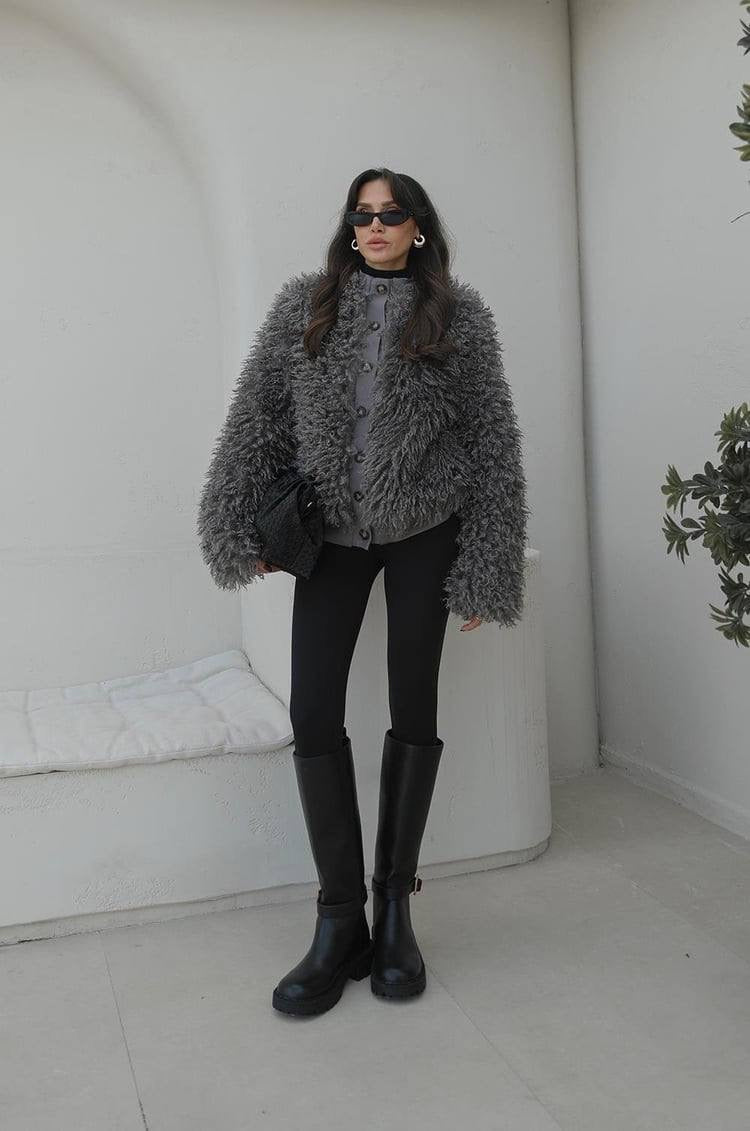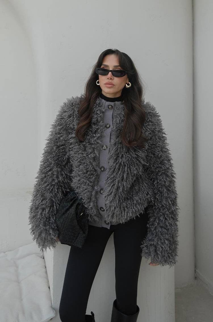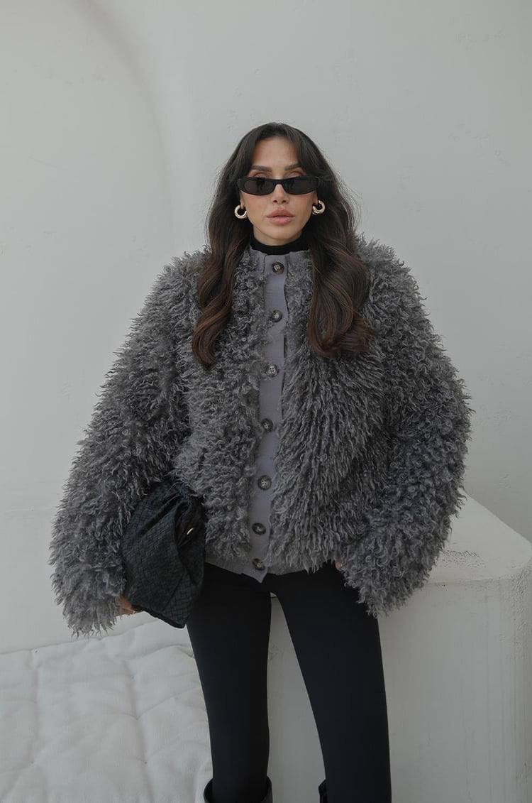 جكيت فرو كيرلي باللون الرمادي