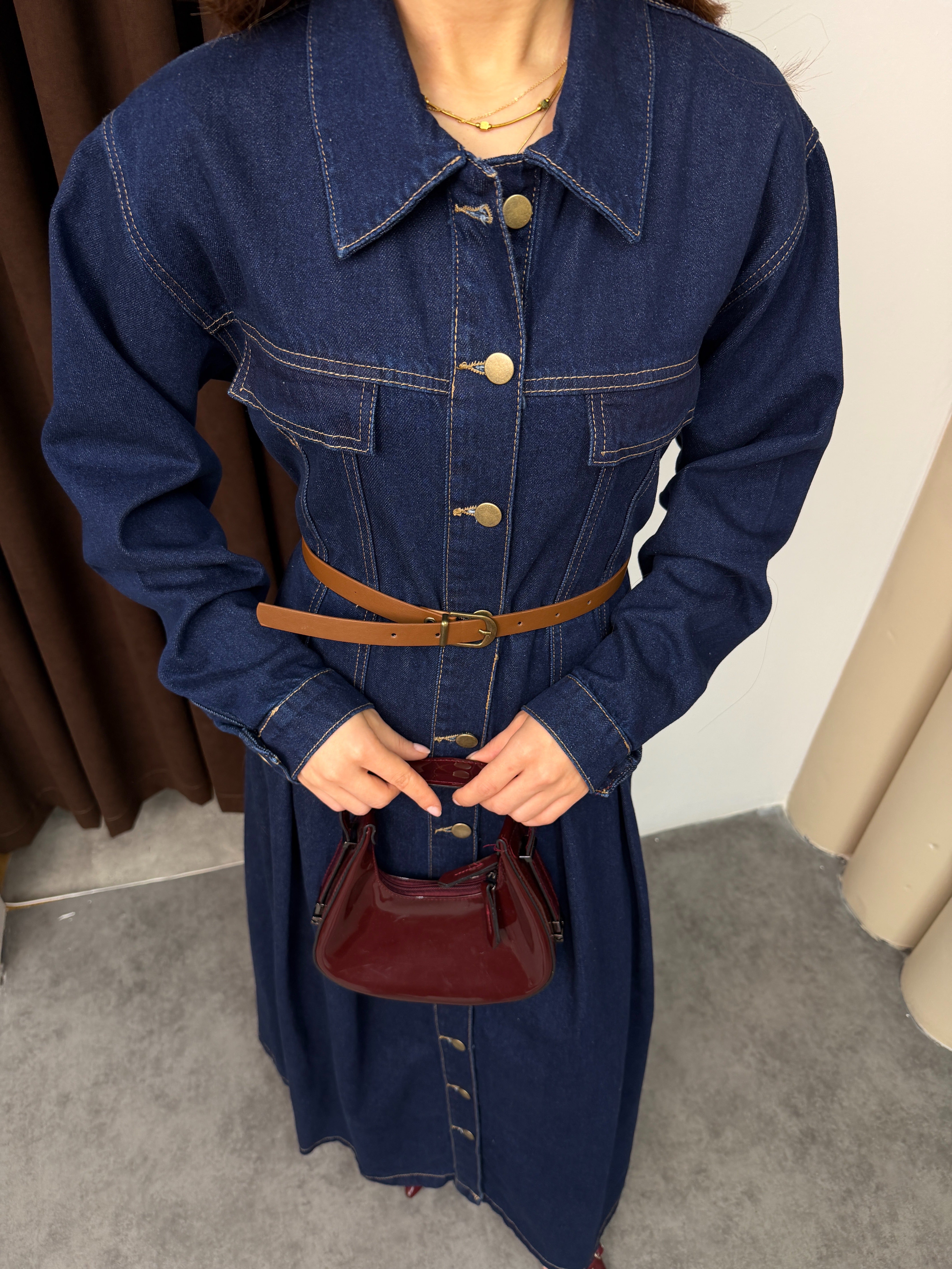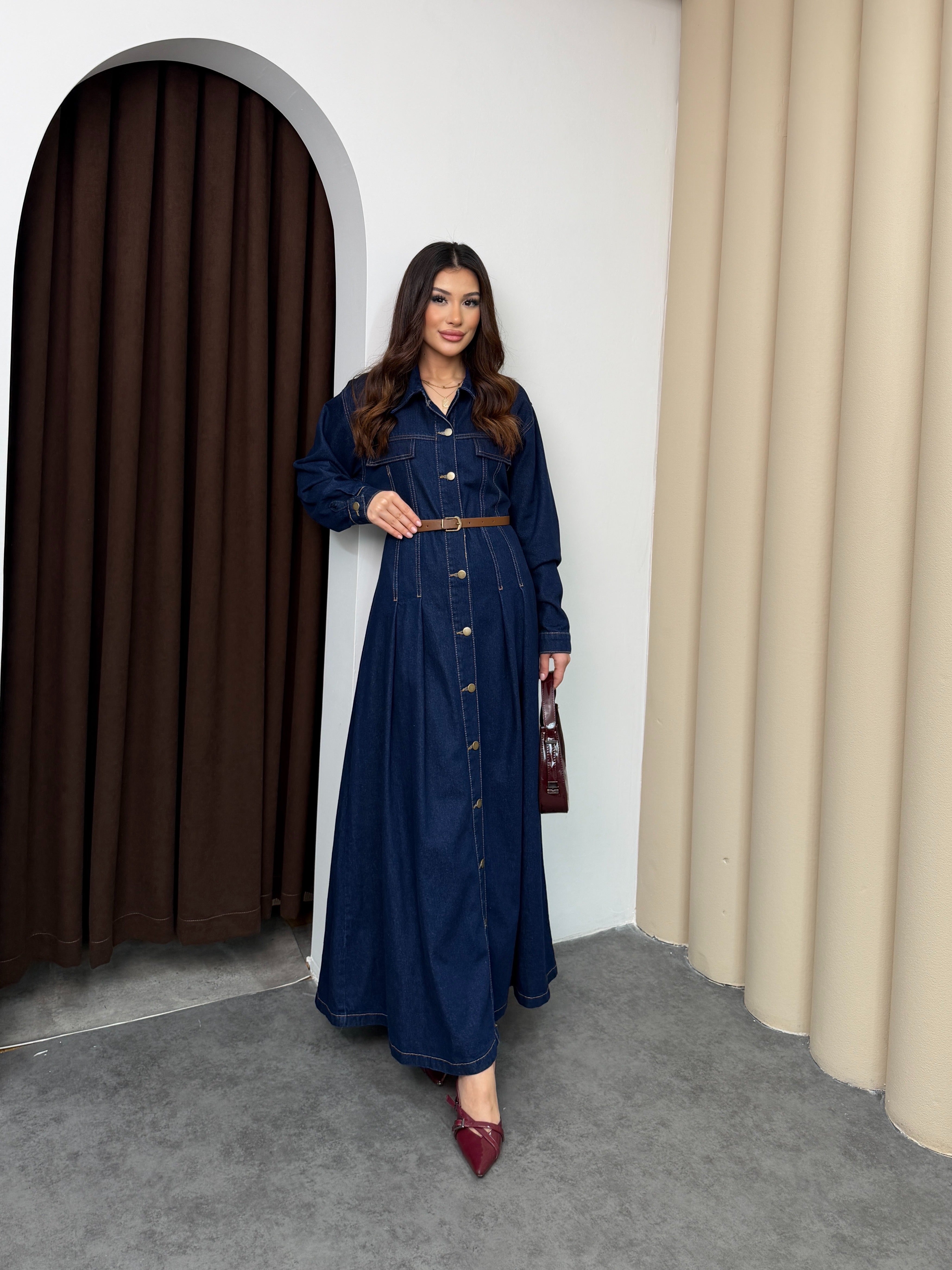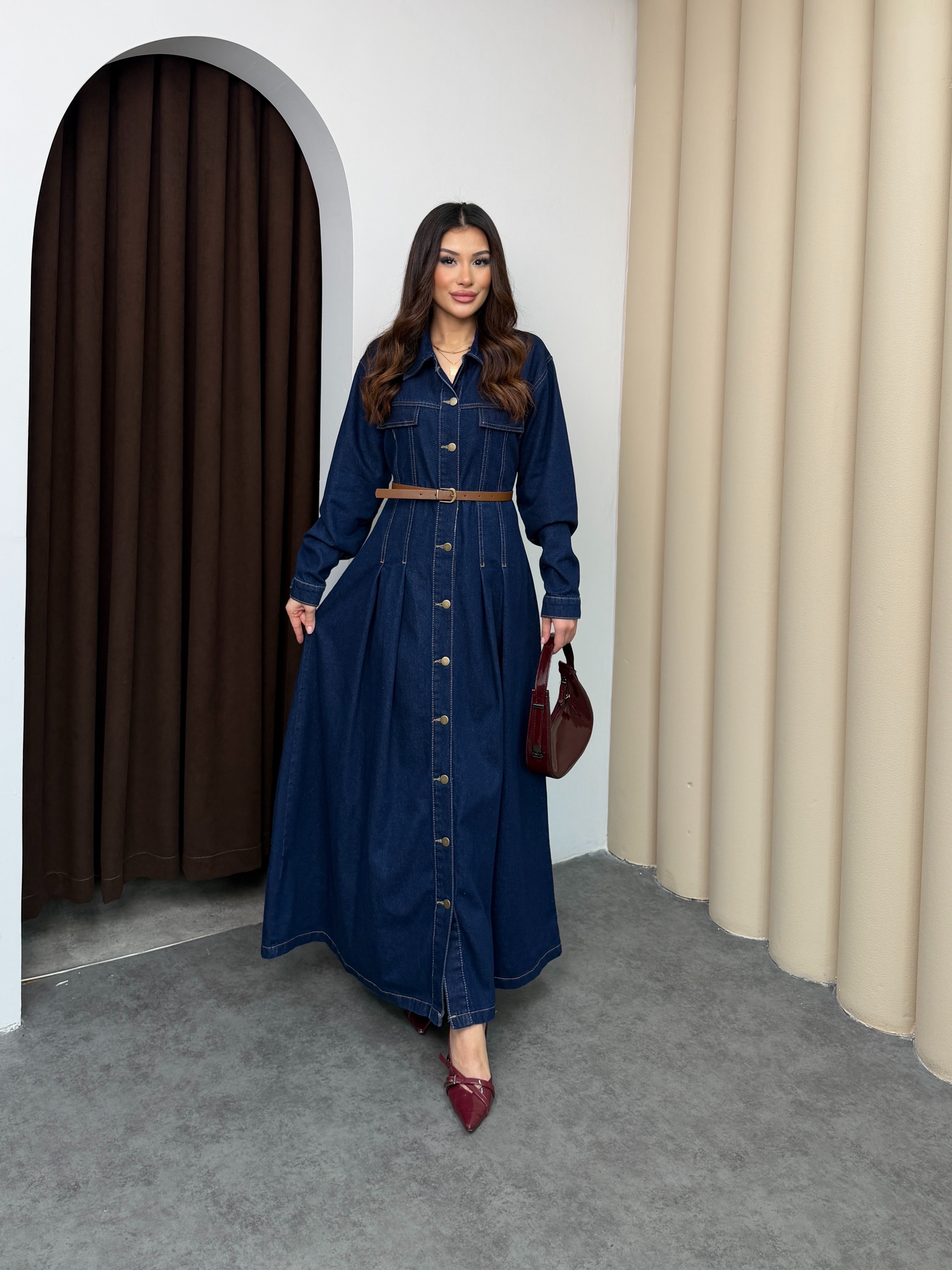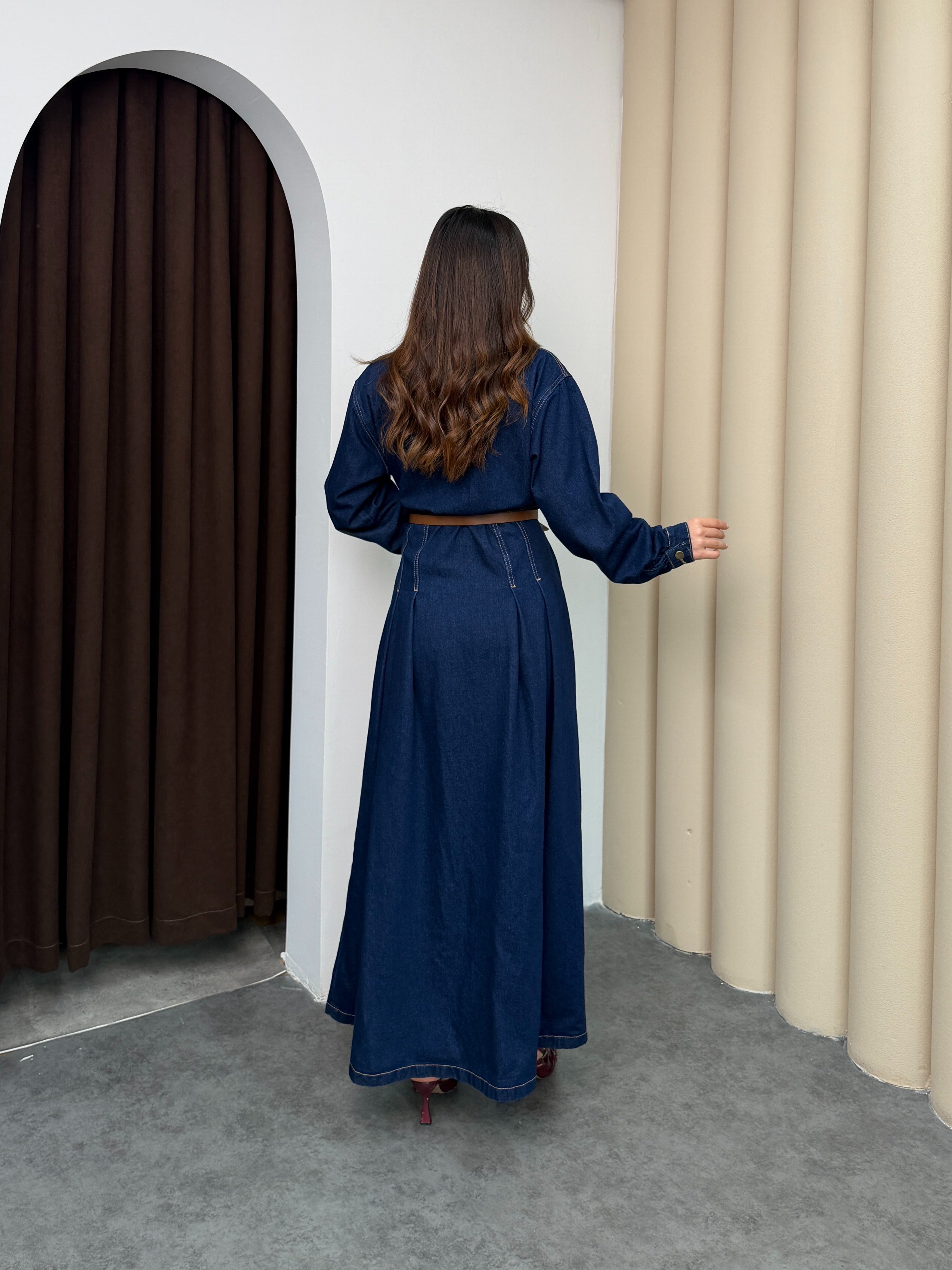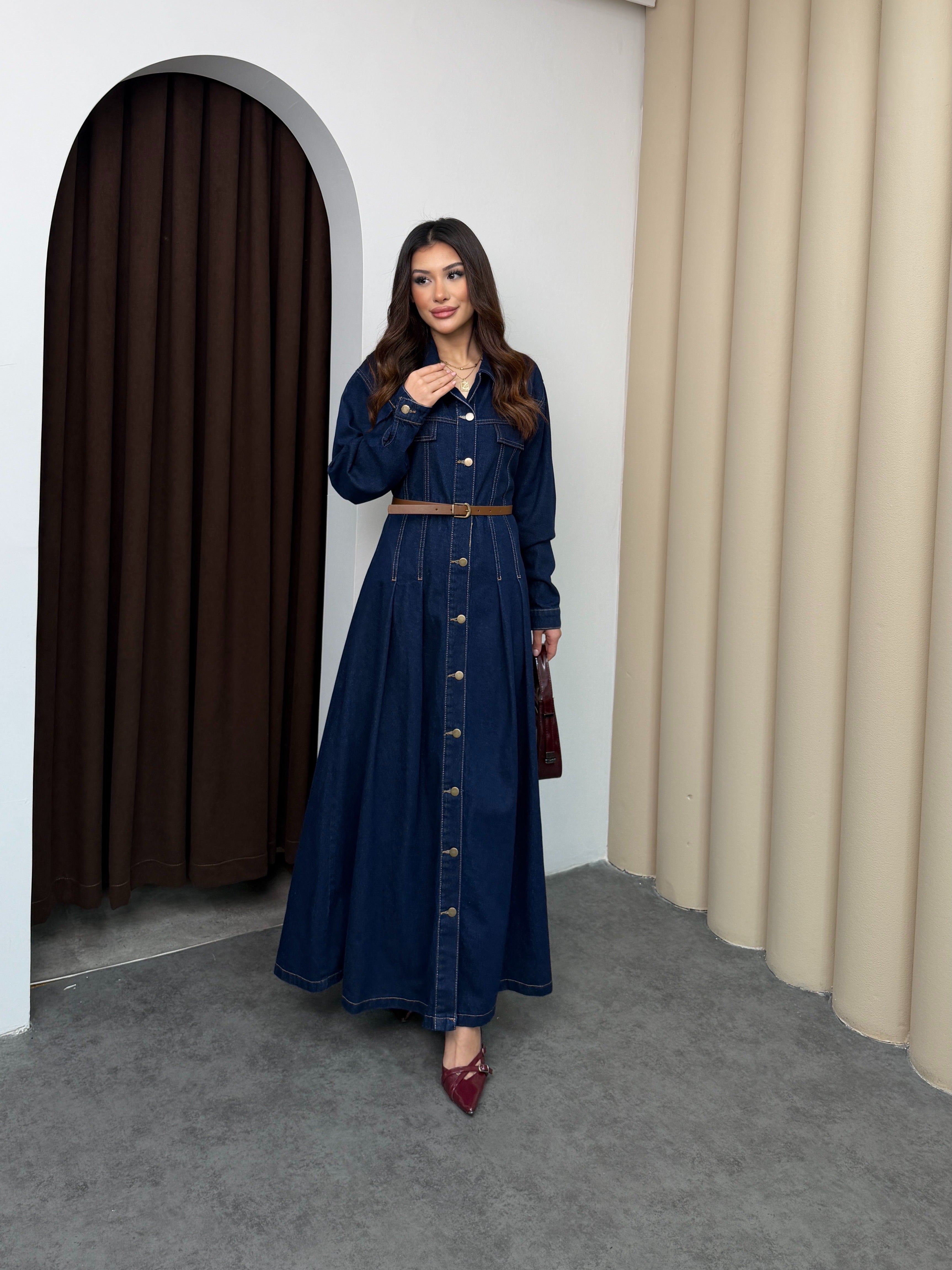 فستان دنيم طويل بقصّة أنثوية واسعة، يتميّز بتصميم أزرار أمامية كاملة مع ياقة كلاسيكية وأكمام طويلة. الخصر محدد بحزام يبرز القوام بشكل مرتب، مع تفاصيل طيّات ناعمة في الجزء السفلي تضيف حركة وأناقة للقطعة. الخامة متينة ومريحة للاستخدام اليومي، وتمنح إطلالة مرتّبة تجمع بين العملية والستايل العصري.