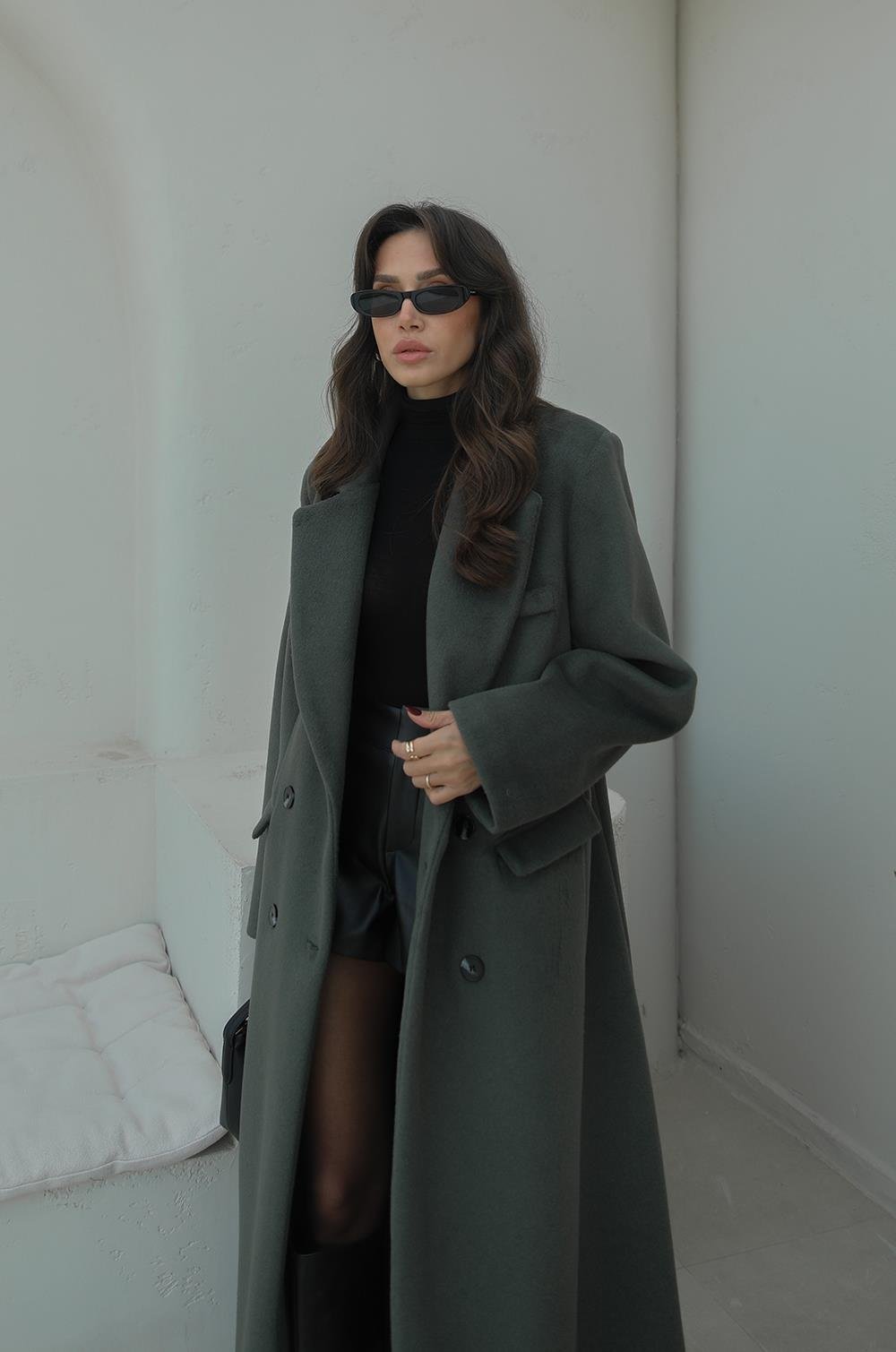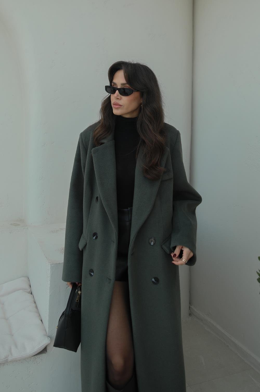 معطف طويل بأكمام طويلة، ياقة طبقات أنيقة، مزوّد بوسائد كتف تصميم أمامي بأزرار، جيوب جانبية بغطاء، شقّ خلفي لسهولة الحركة، ومبطّن بالكامل من الداخل.