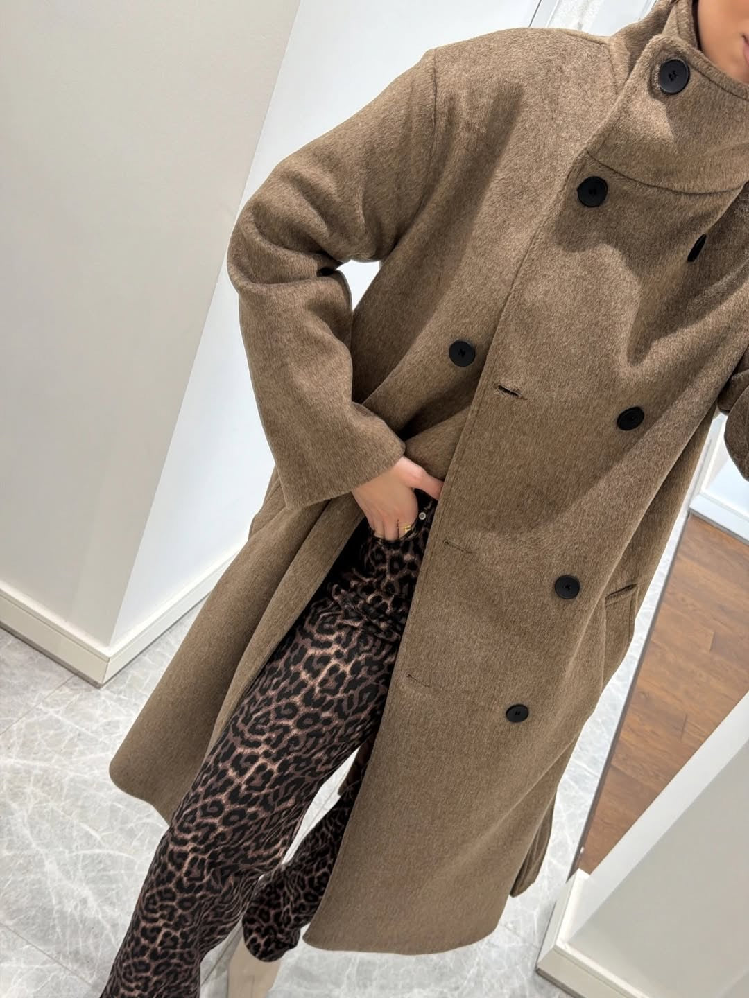 معطف صوف ناعم بياقة عالية باللون البيج المائل للبني