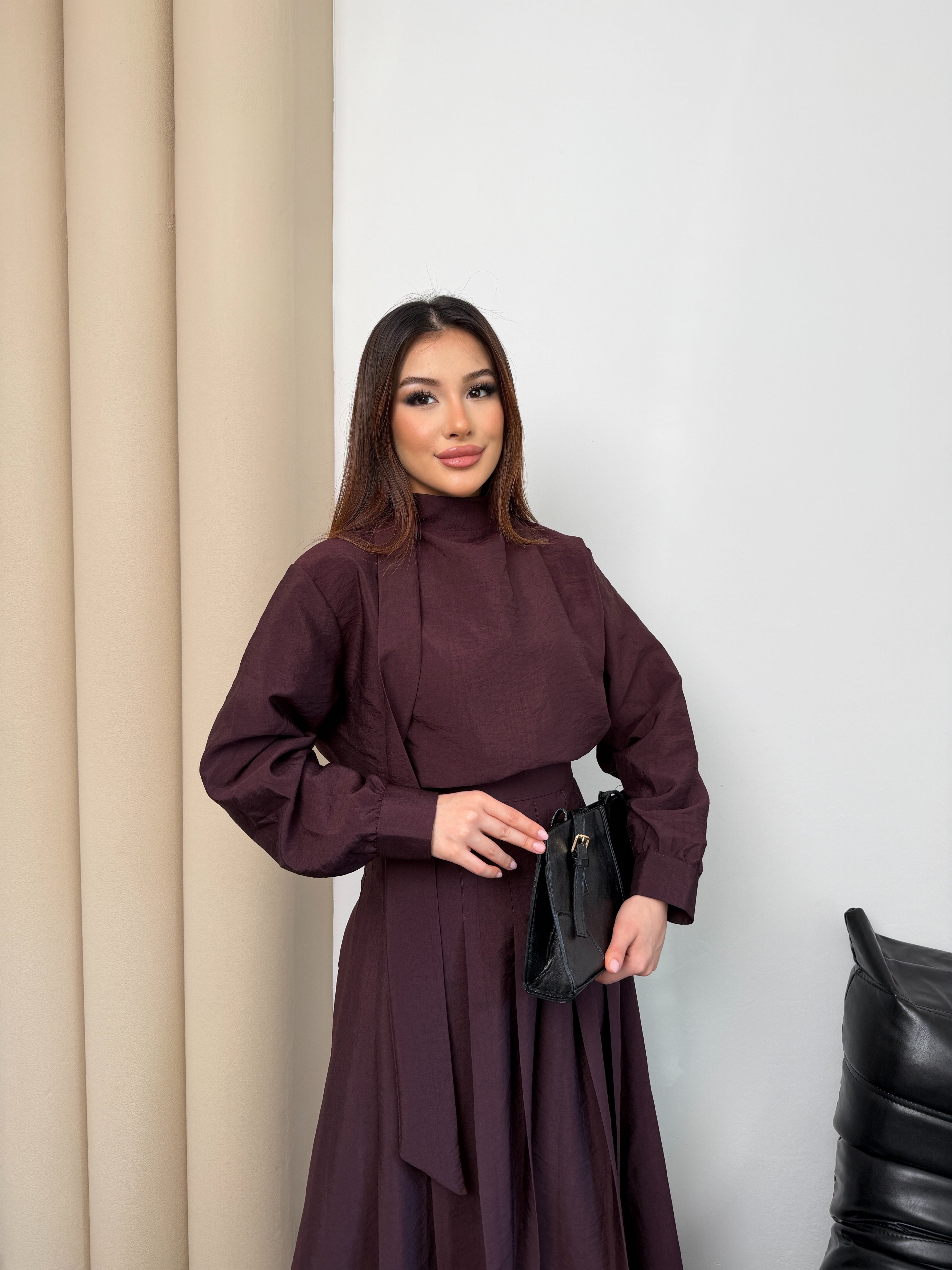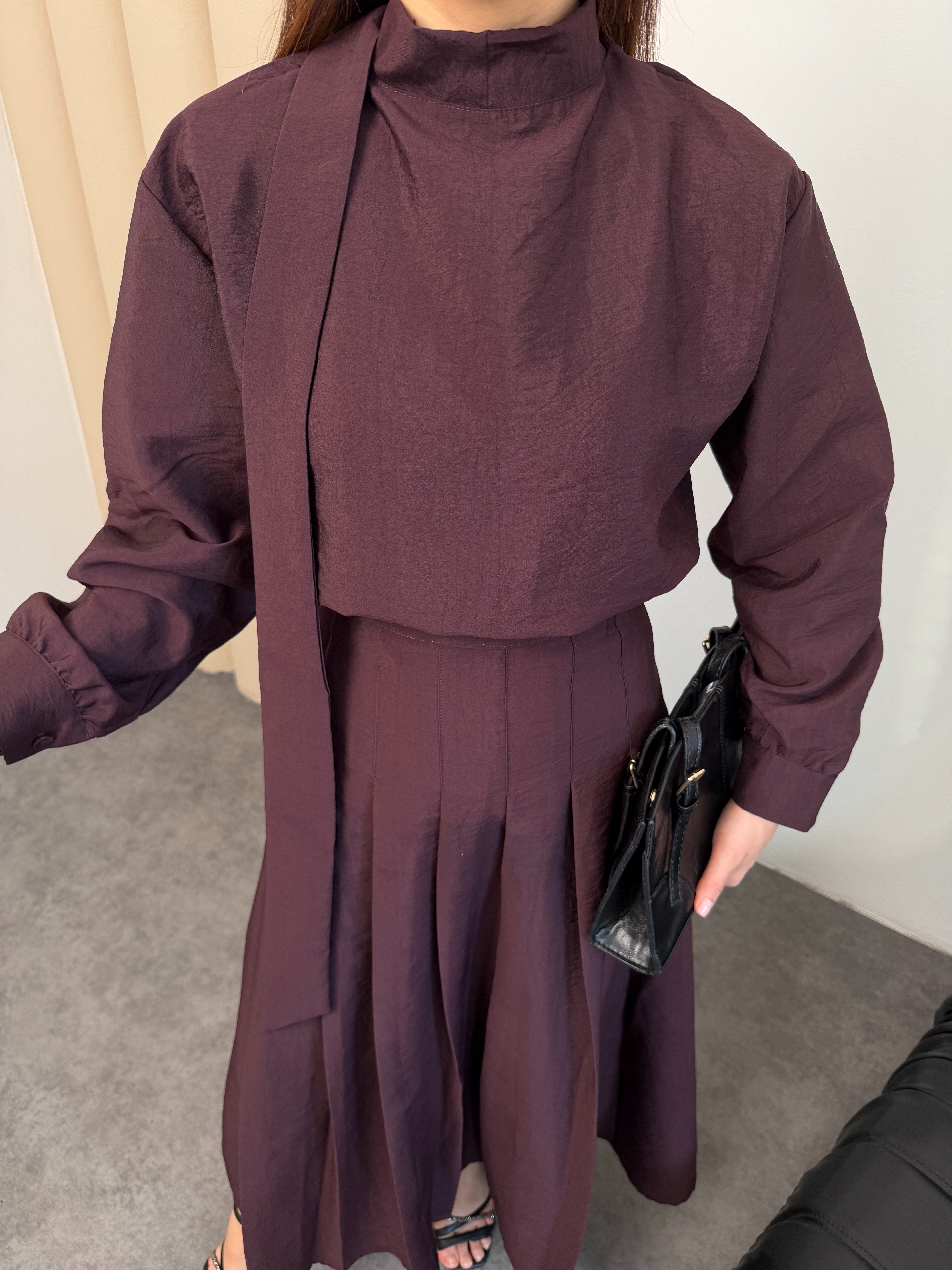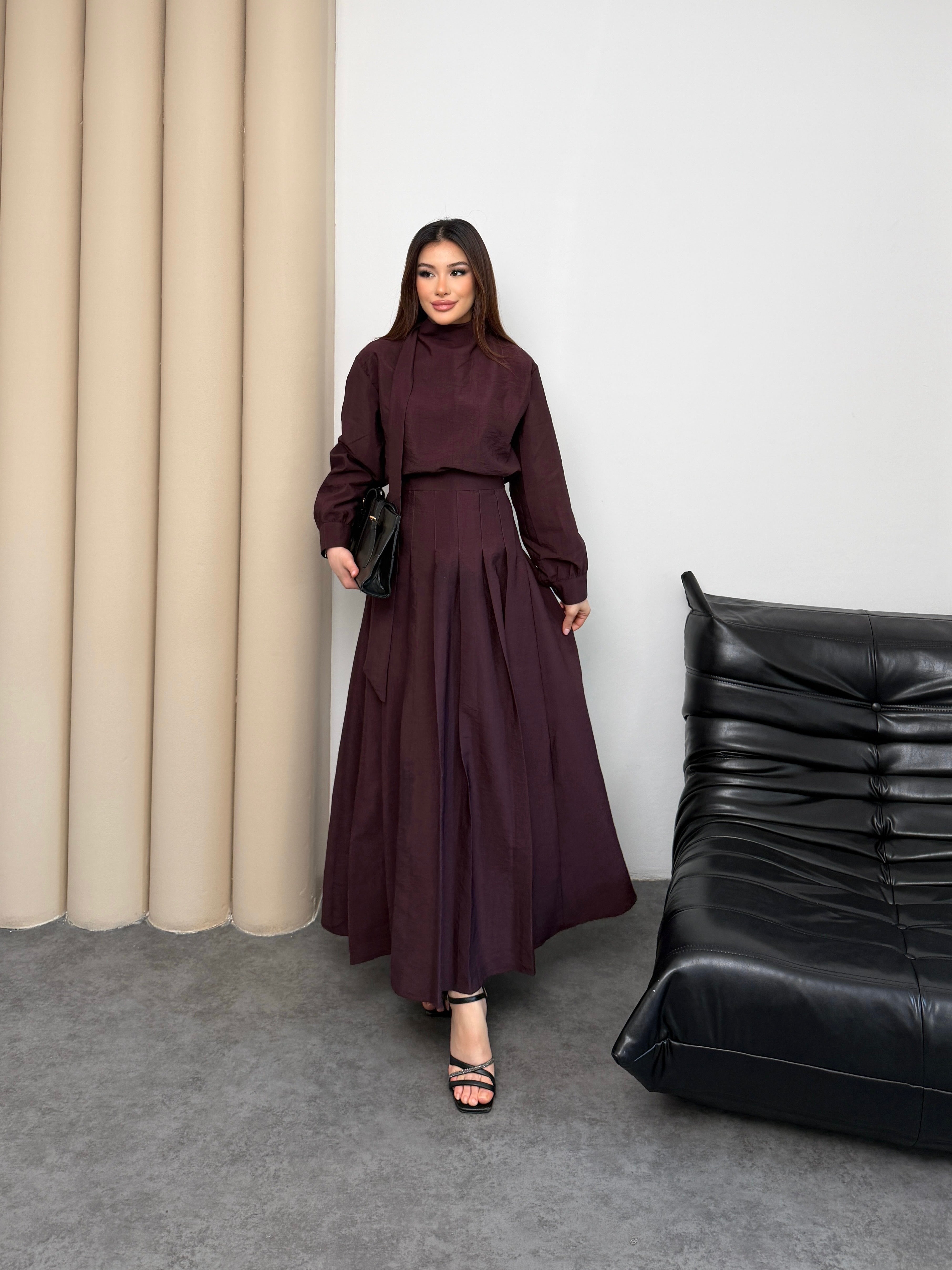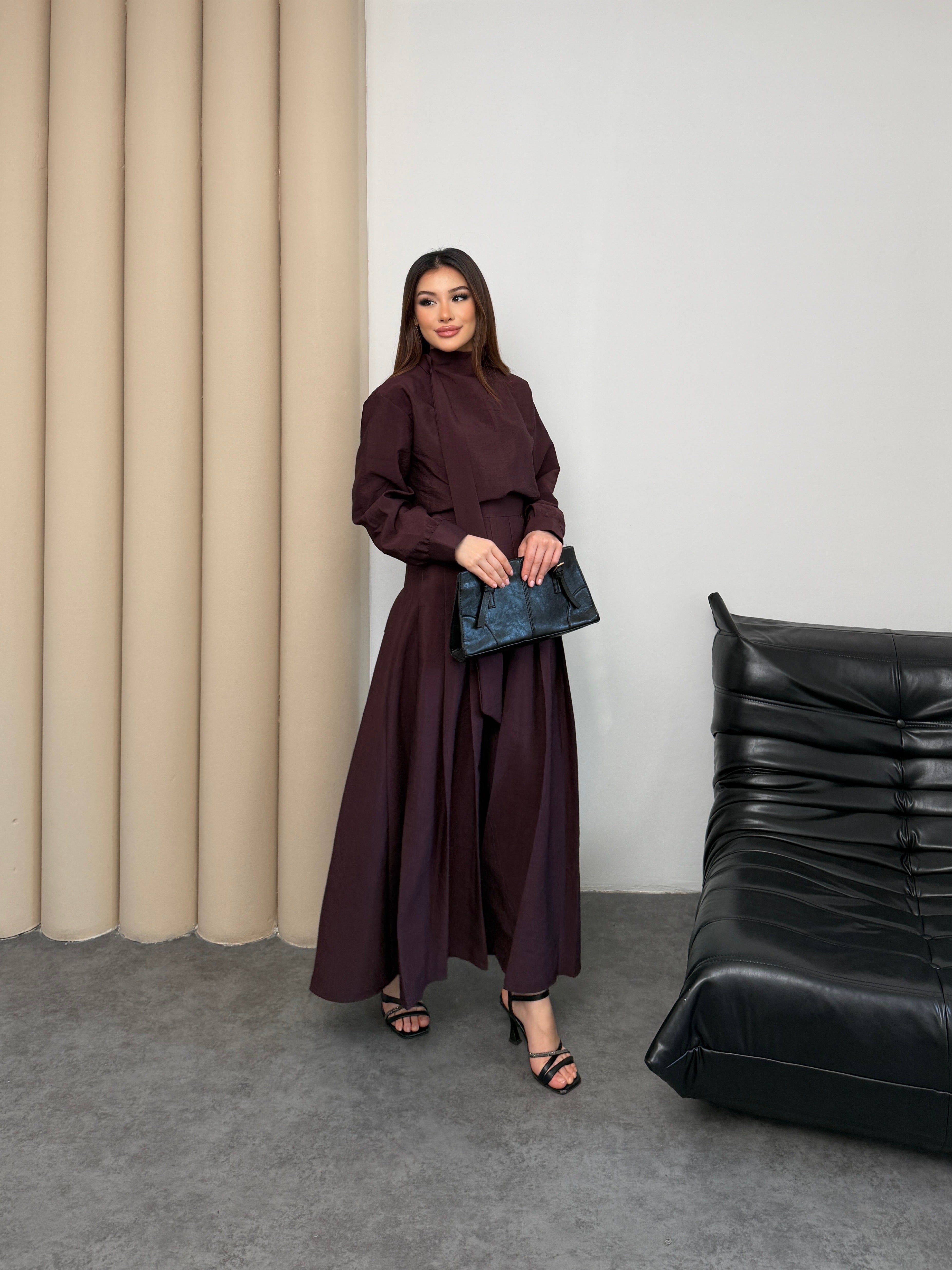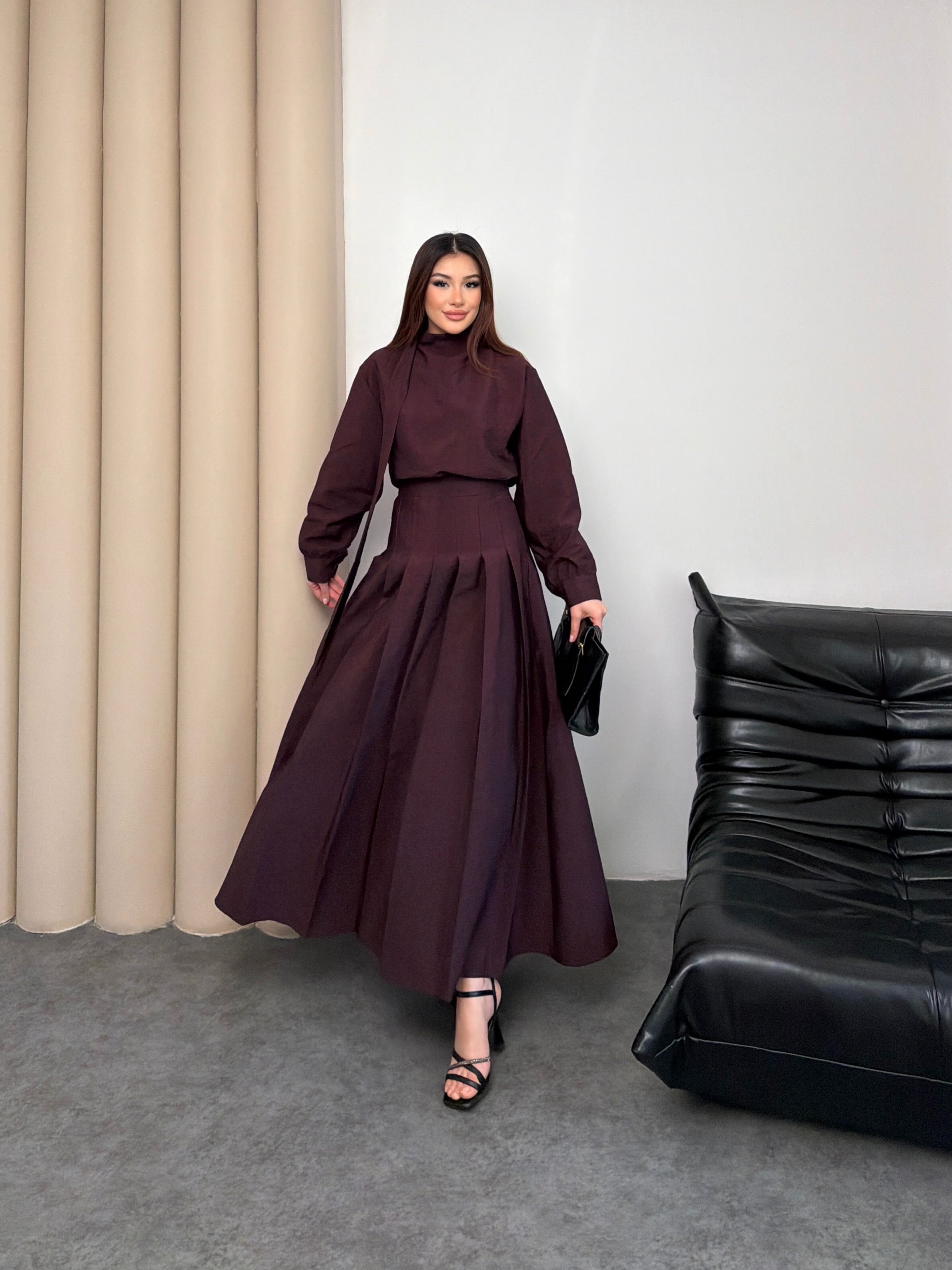 طقم راقي بتصميم أنثوي أنيق مكوّن من بلوزة بقصة محتشمة مع تنورة ميدي واسعة بطيات ناعمة تعطي حركة فخمة مع كل خطوة 🤍