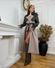 جكيت طويل بتصميم ترنش راقٍ، يجمع بين الاسود وقصّة جلدية عند الأكتاف والأكمام، ليعطي مظهراً فخماً وعصرياً بنفس الوقت.