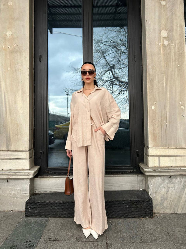 طقم ناعم مكوّن من قميص بأكمام طويلة ،طول الجكيت 74 سم وبنطال بخصر مطاطي مريح ، بقصة مستقيمة وانسيابية، مثالي للإطلالات اليومية والأنيقة.