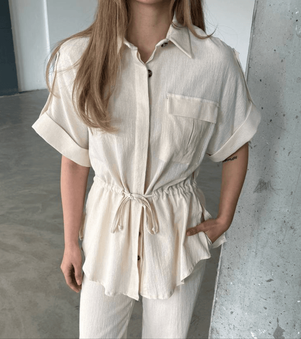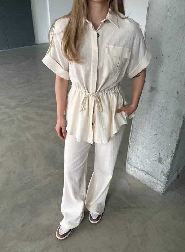 طقم ناعم مكوّن من قميص بأكمام قصيرة ،طول الجكيت 63 سم وبنطال بخصر مطاطي مريح ، بقصة مستقيمة وانسيابية، مثالي للإطلالات اليومية والأنيقة.
