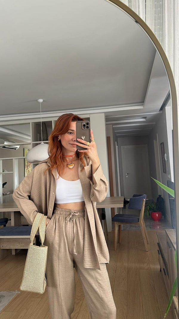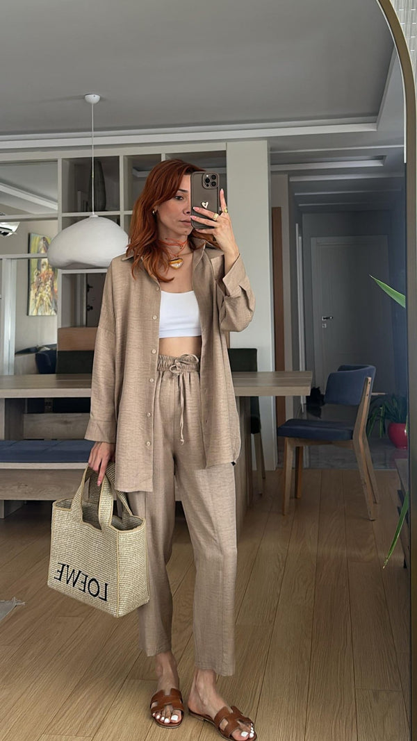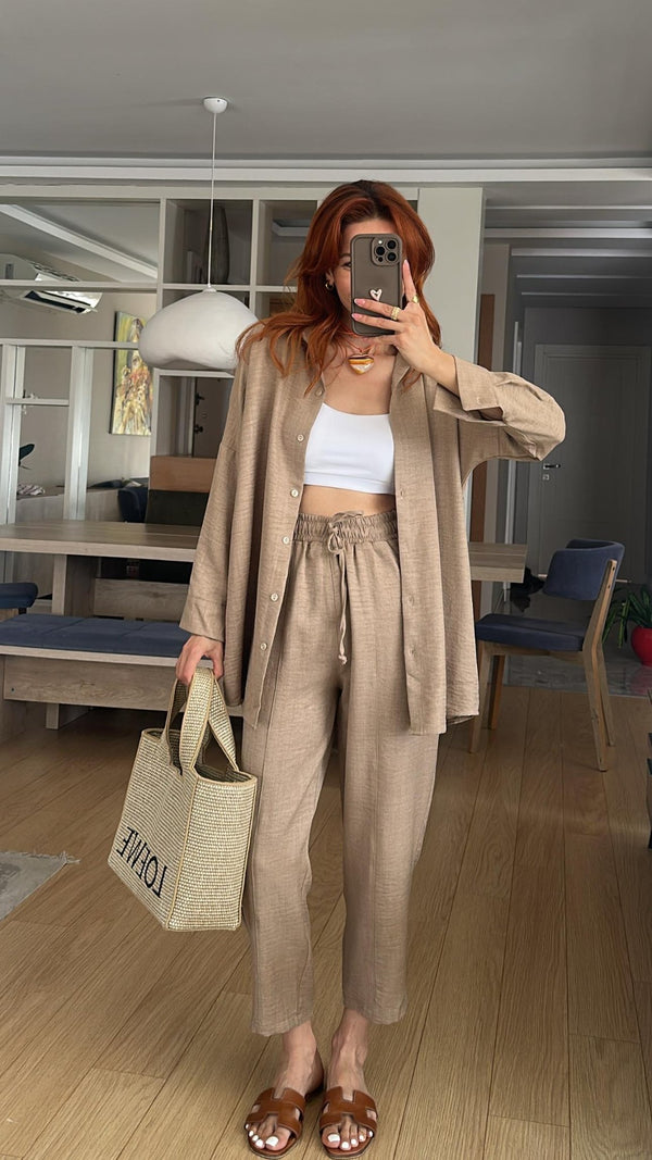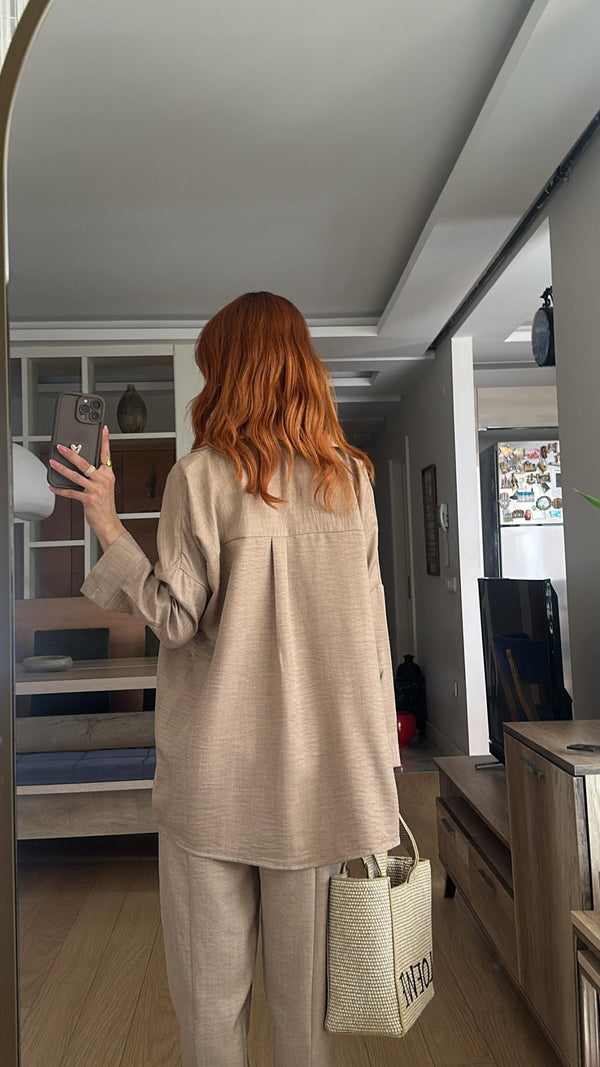 طقم ناعم مكوّن من قميص بأكمام طويلة ،طول الجكيو 75 سم وبنطال بخصر مطاطي مريح طول ٩٣ سم. مناسب للمحجبات، بقصة مستقيمة وانسيابية، مثالي للإطلالات اليومية والأنيقة.