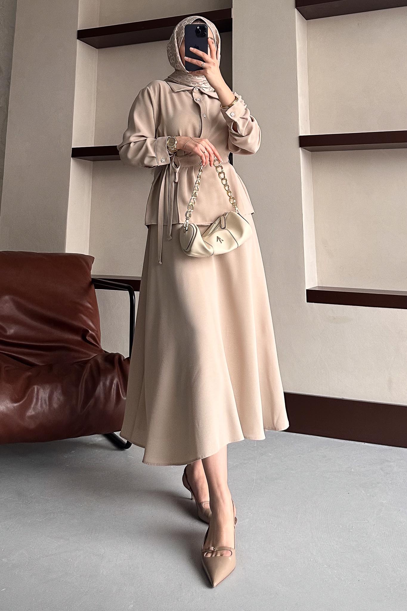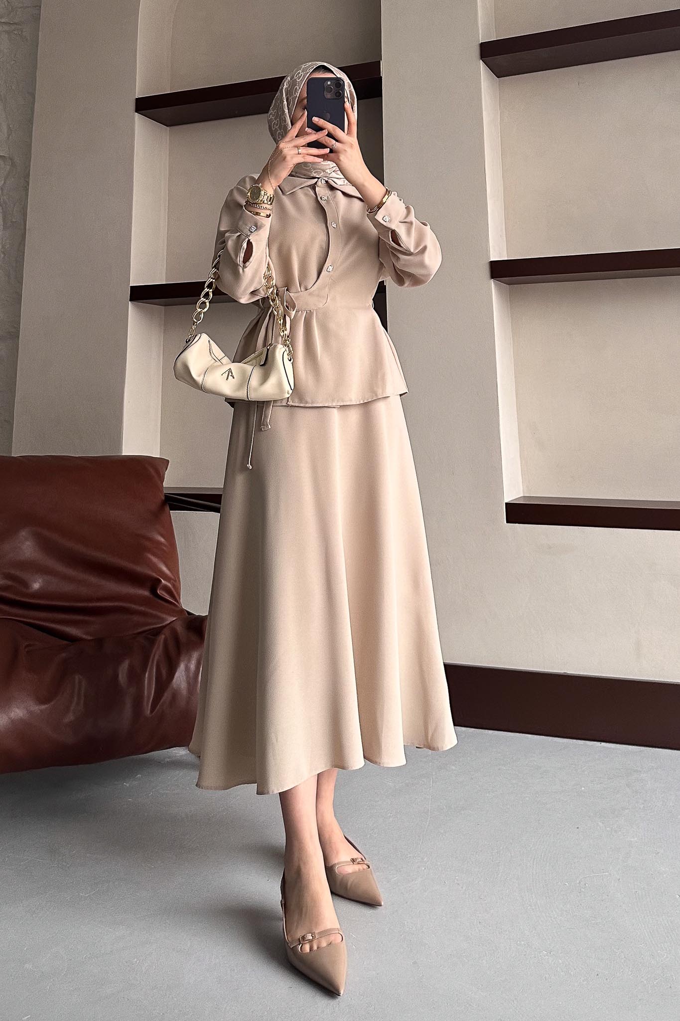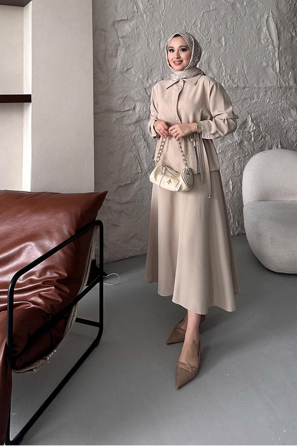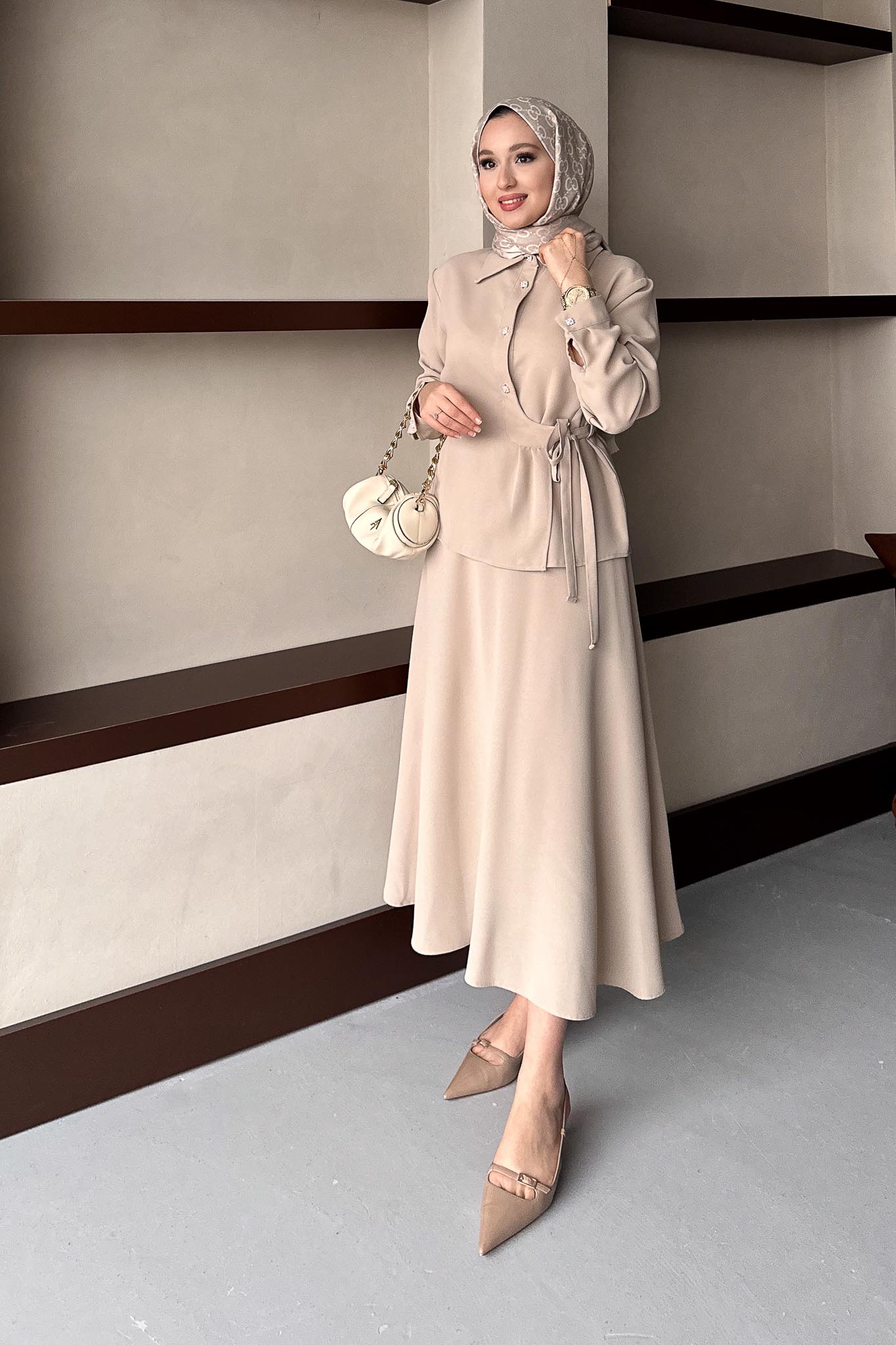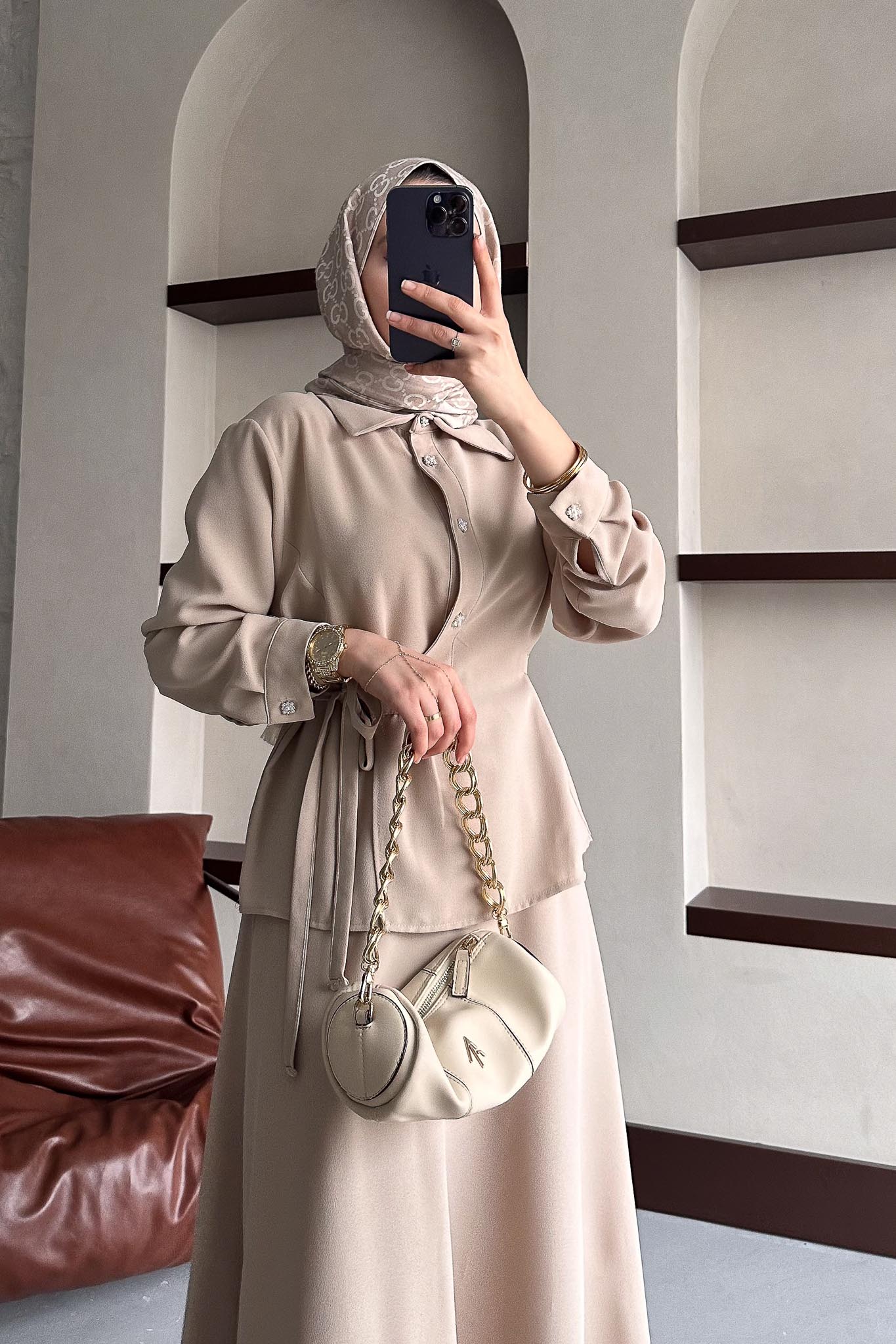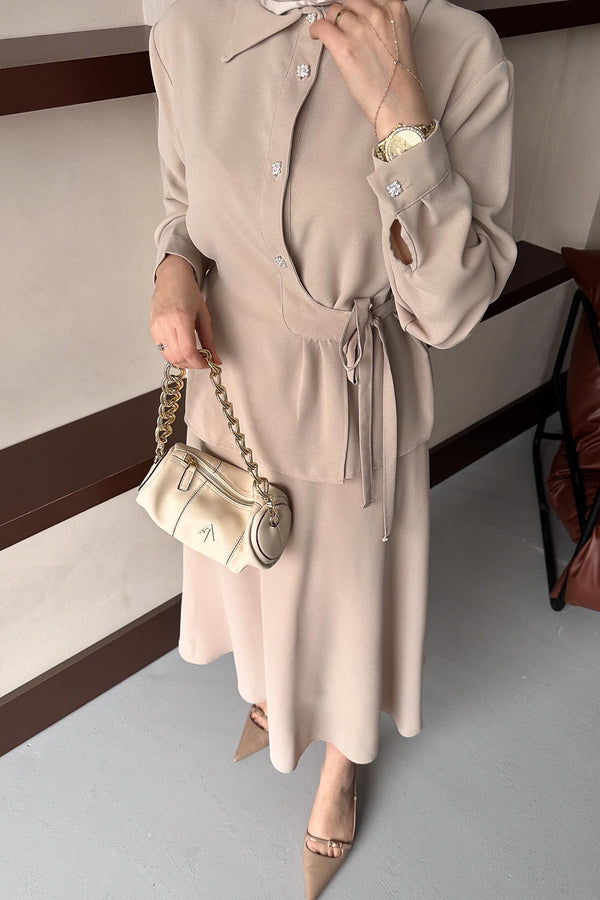 طقم كريب عالي الجودة مع ربطة وازرار فضية - بيج
