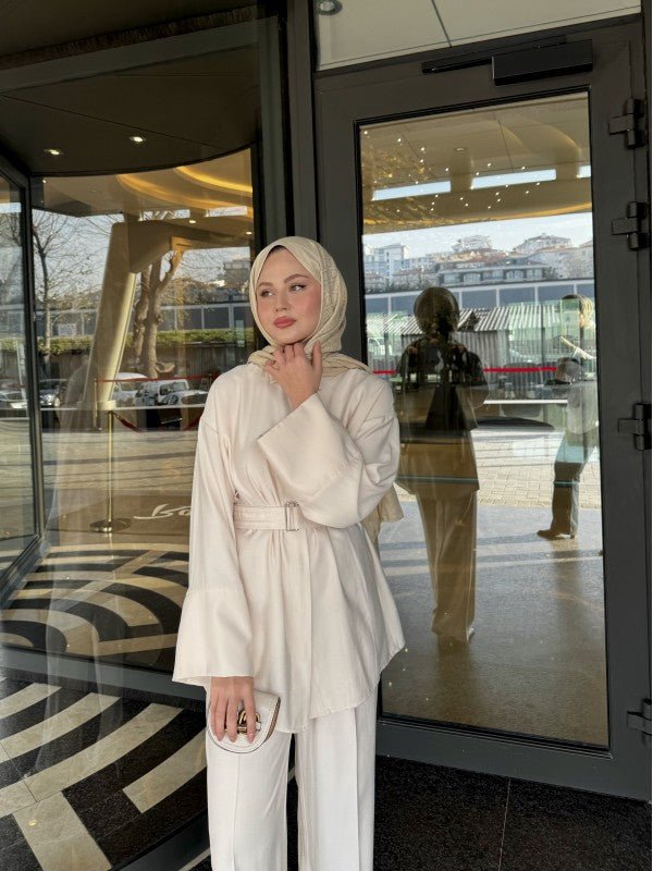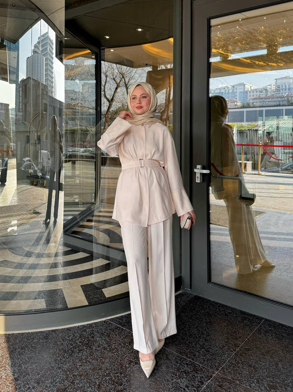 طقم مع حزام خياطة مزخرف بيج - Sateen styleطقم مع حزام خياطة مزخرف بيج - Sateen style