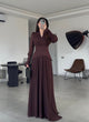 يتميّز بقصّة مريحة مع حزام على الخصر يبرز القوام بشكل ناعم وأنثوي، وأكمام طويلة بلمسة خفيفة عند المعصم تضيف أناقة هادئة.