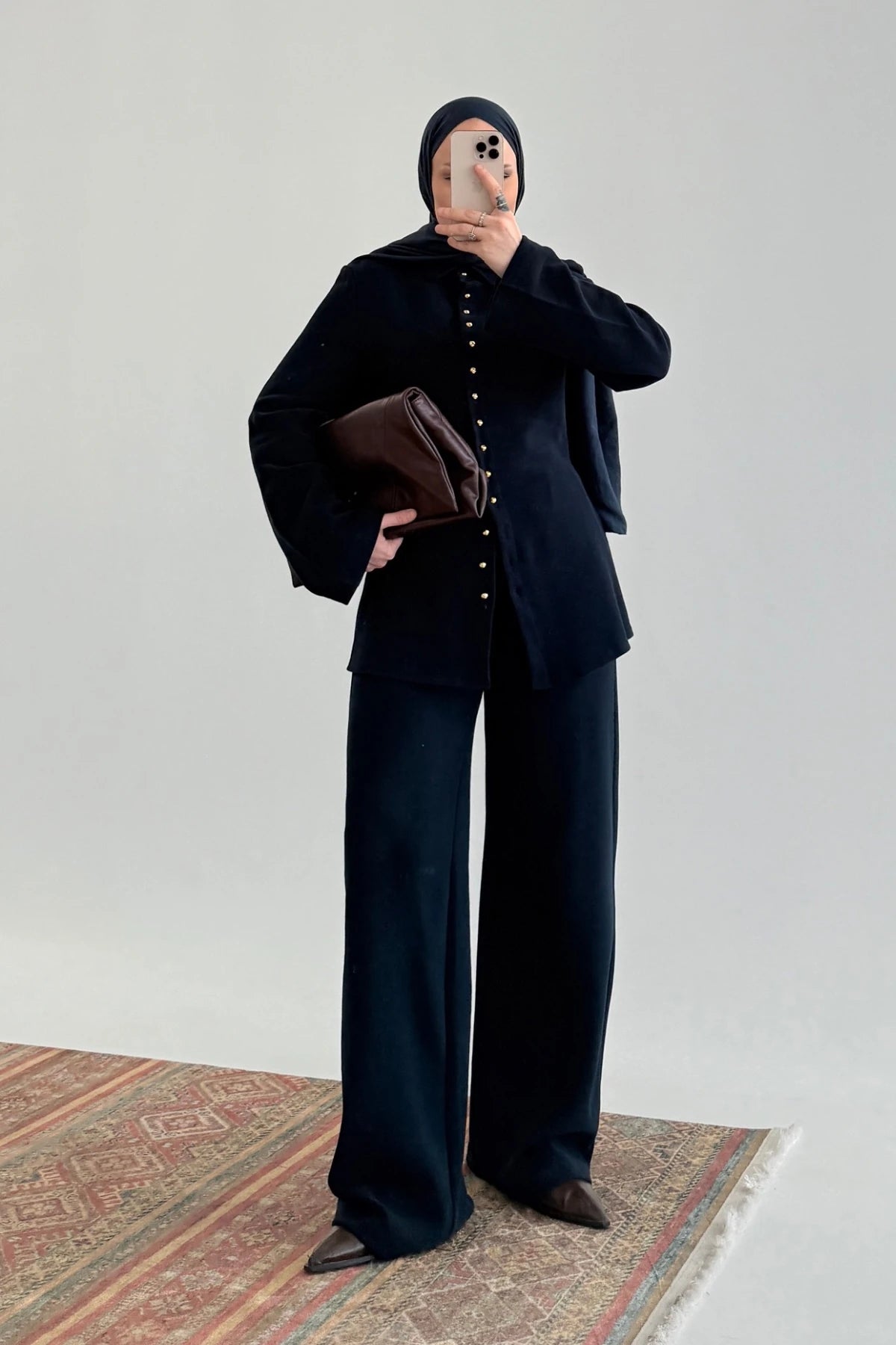 يأتي مع بنطال بقصّة مستقيمة تعكس حضوراً عملياً وأنثوياً في آن واحد.