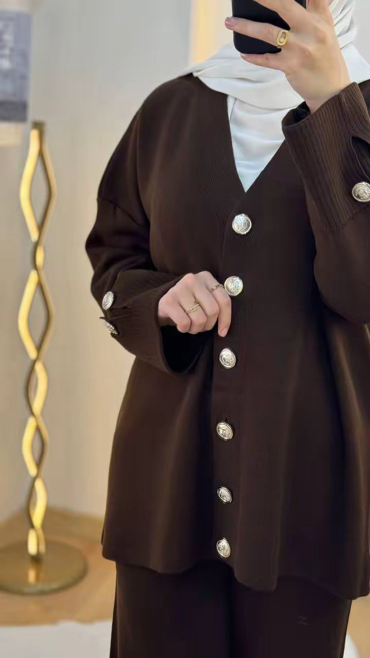 طقم صوف تريكو بازرار ذهبية باللون البني