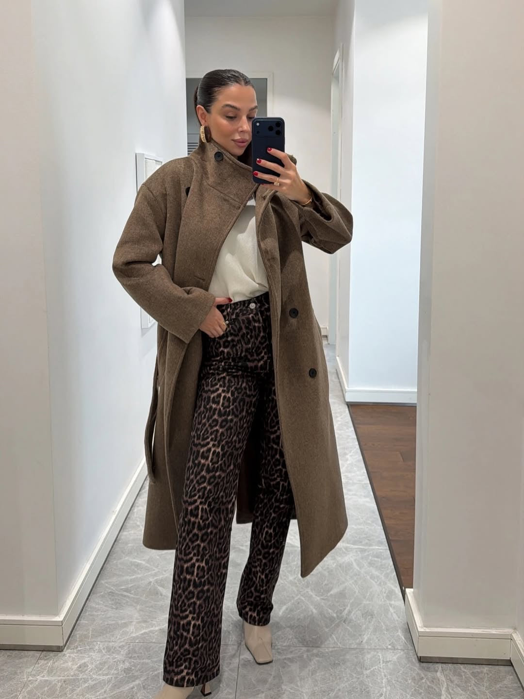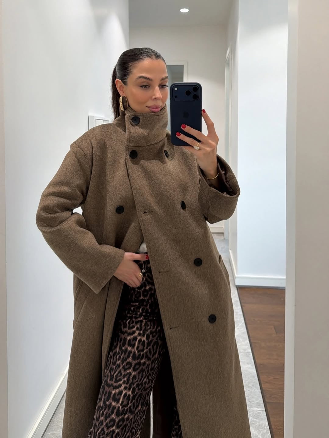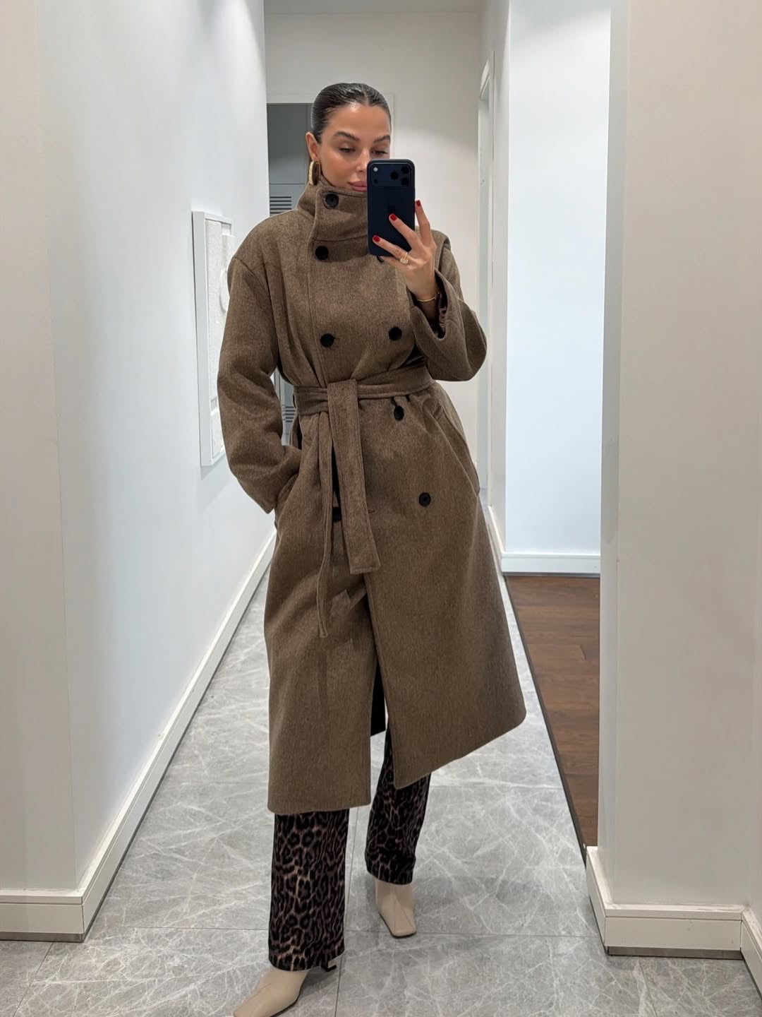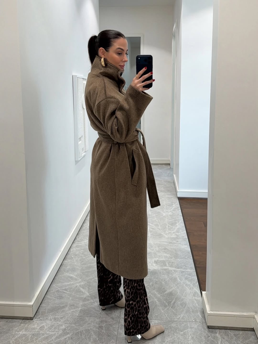 معطف صوف ناعم بياقة عالية باللون البيج المائل للبني