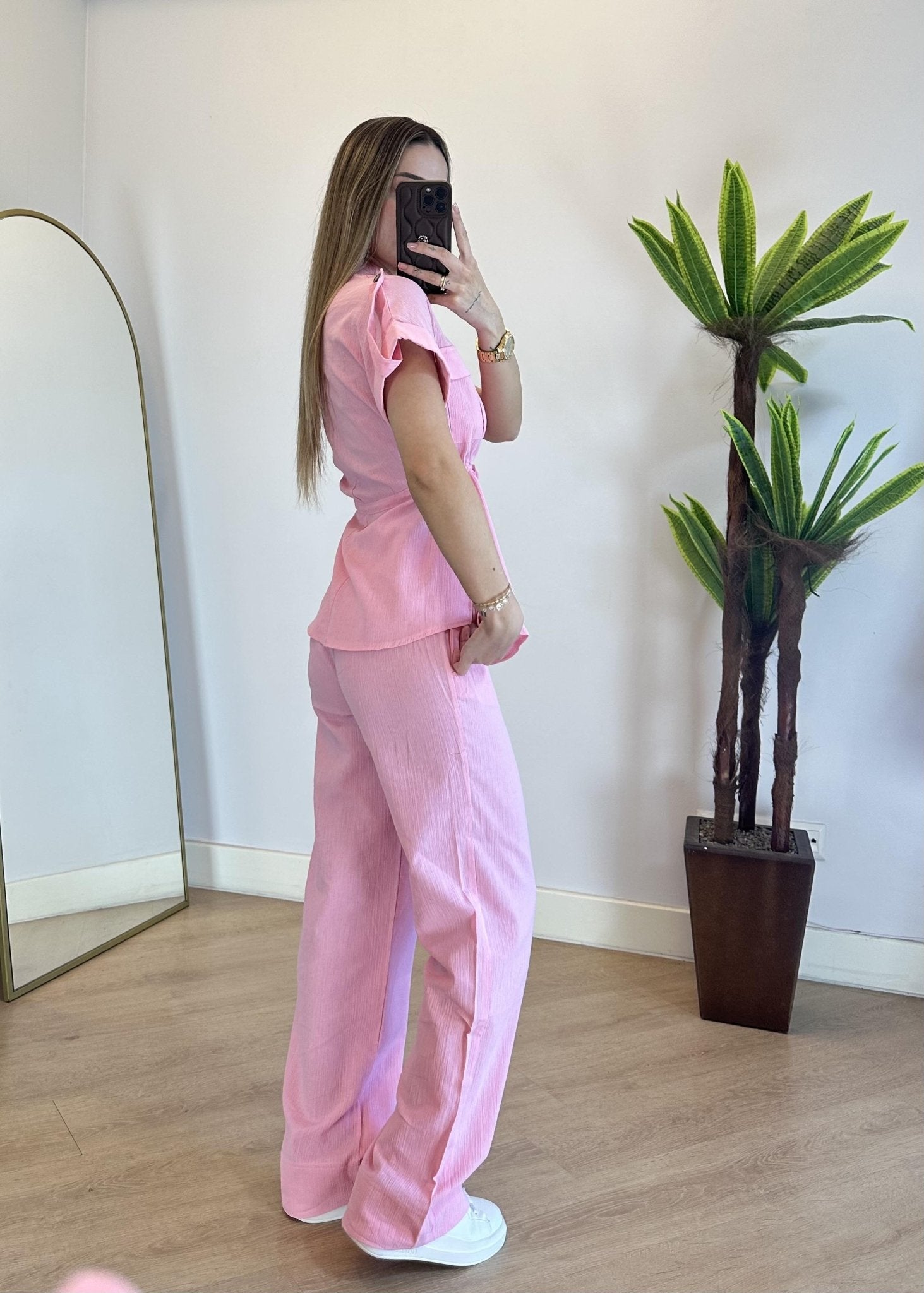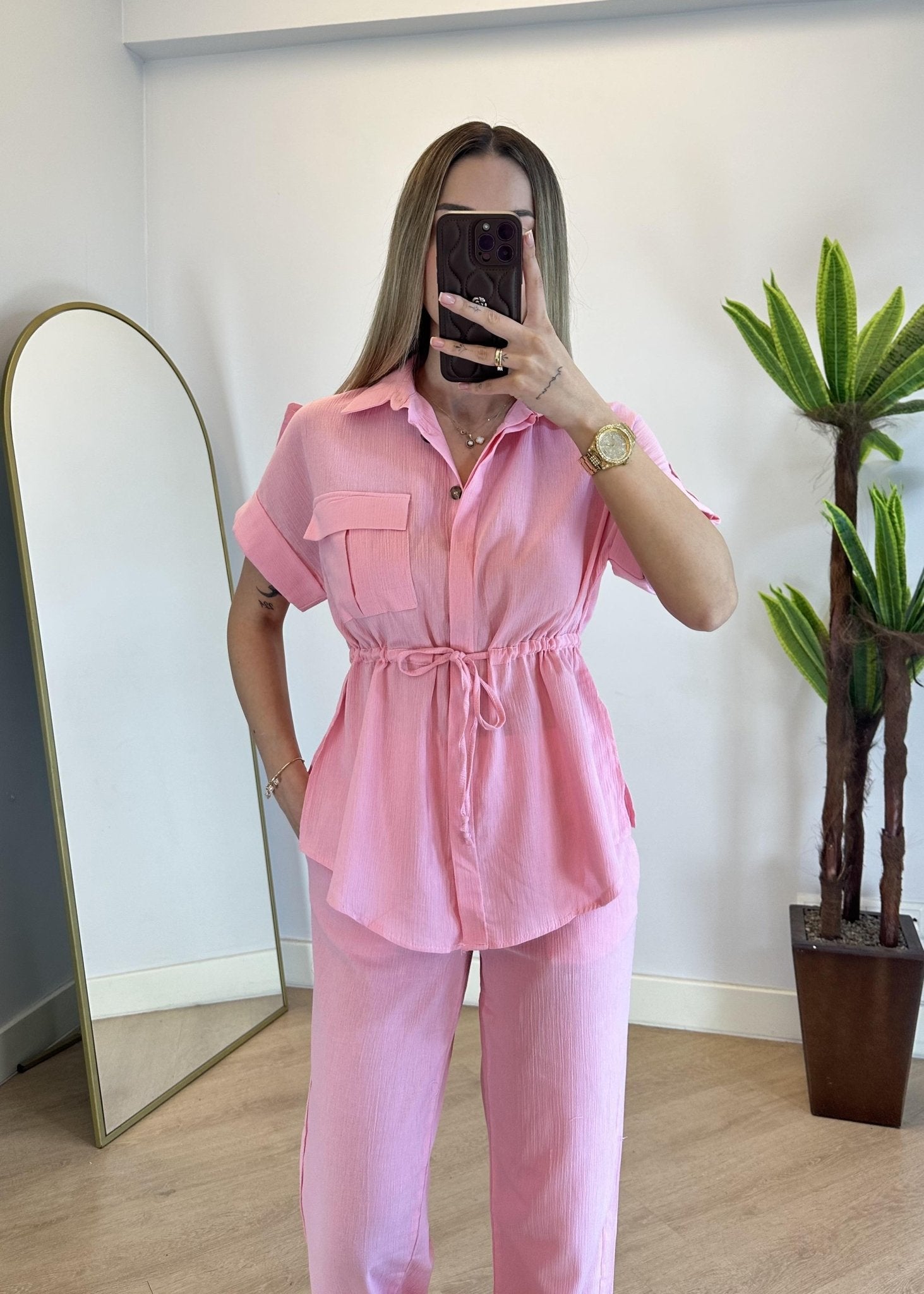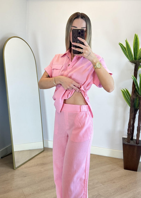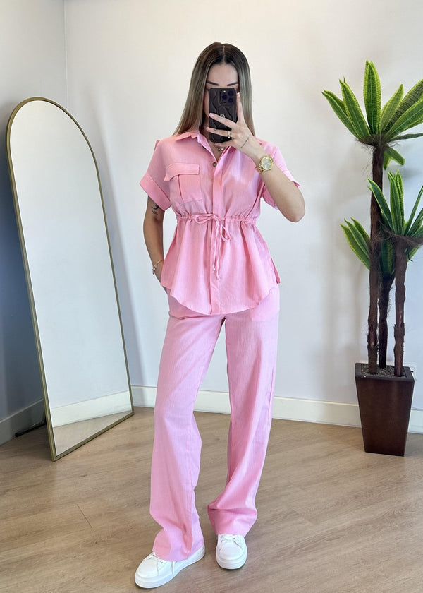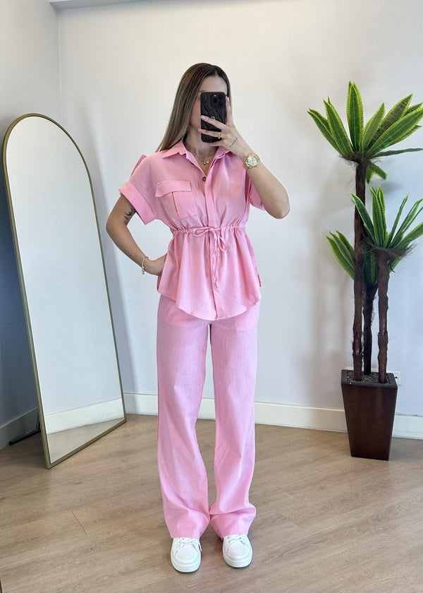 طقم ناعم مكوّن من قميص بأكمام قصيرة ،طول الجكيت 63 سم وبنطال بخصر مطاطي مريح ، بقصة مستقيمة وانسيابية، مثالي للإطلالات اليومية والأنيقة.