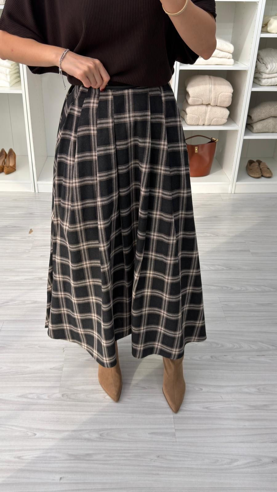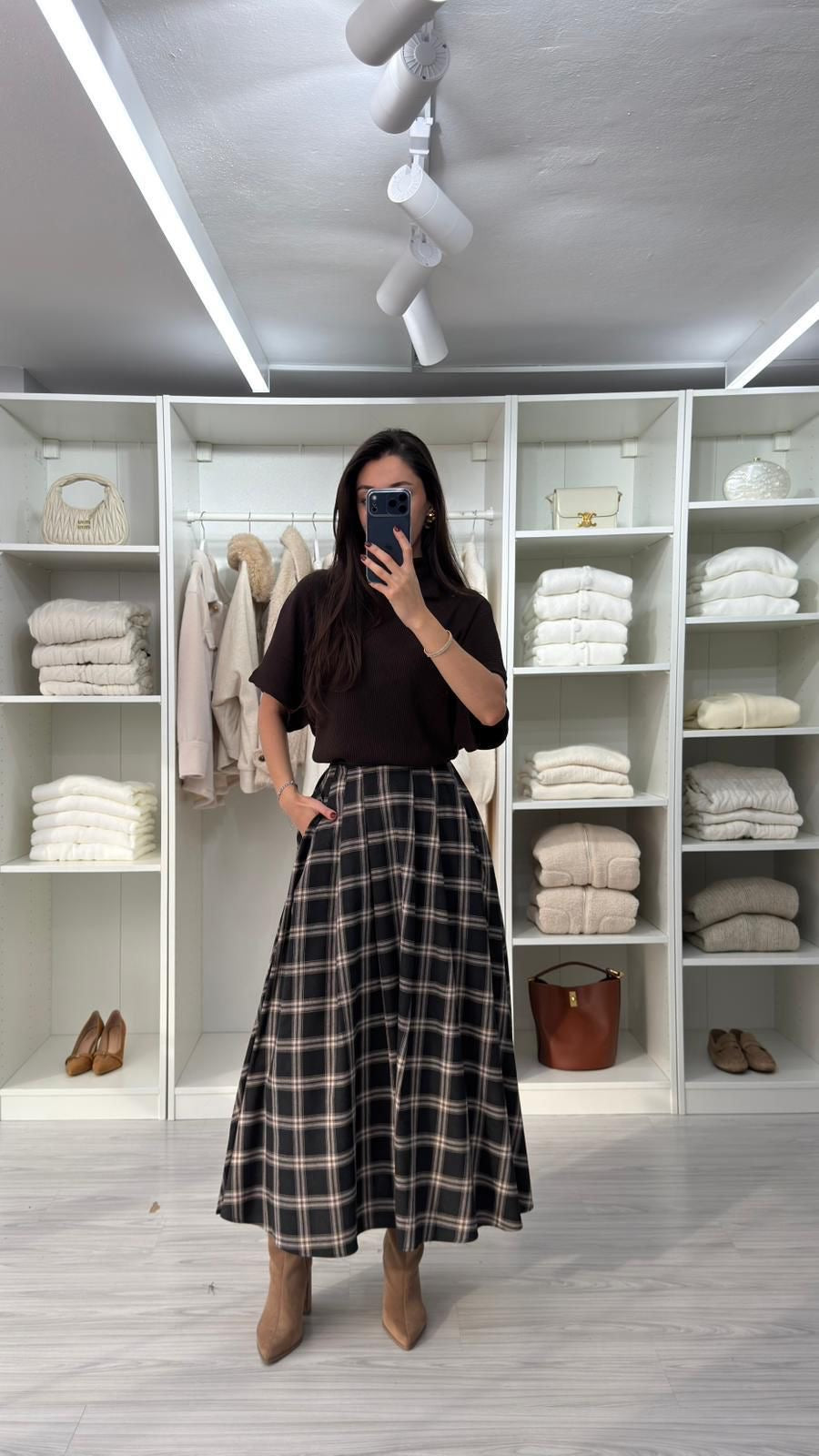 تنورة طويلة بقصة واسعة وانسيابية، مصممة بنقشة الكاروه الكلاسيكية باللون الخمري مع خطوط فاتحة أنيقة. مصنوعة من قماش مريح وعالي الجودة، تمنح مظهراً أنثوياً راقياً ومناسبة للاستخدام اليومي والمناسبات البسيطة. سهلة التنسيق مع مختلف القطع، وتناسب الإطلالات المحتشمة والعصرية في آنٍ واحد.