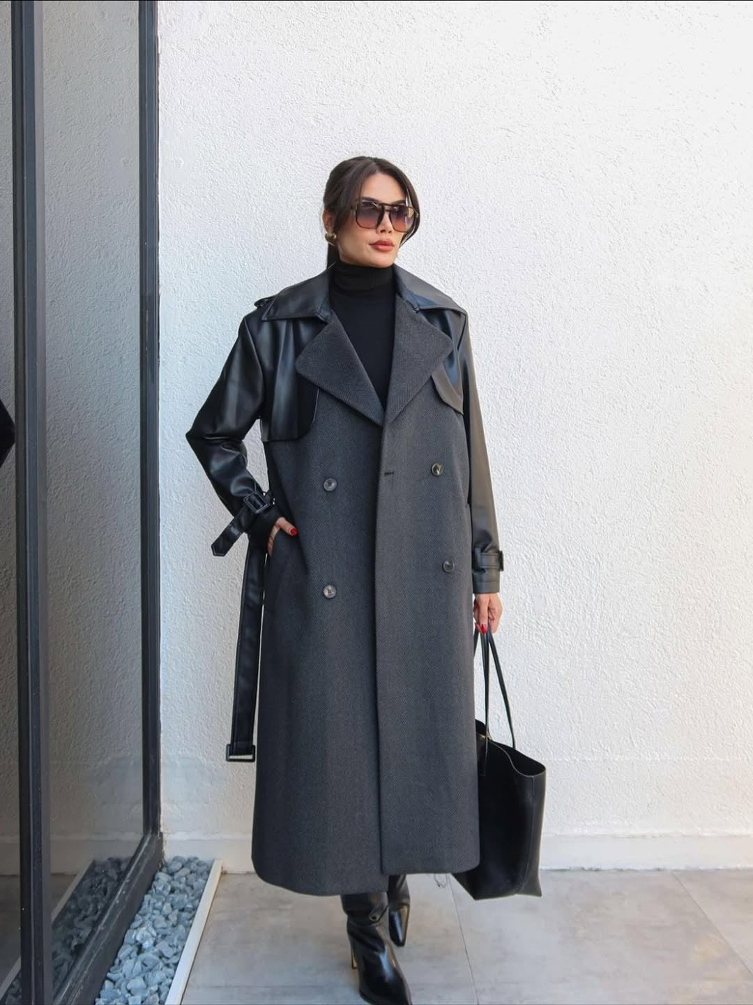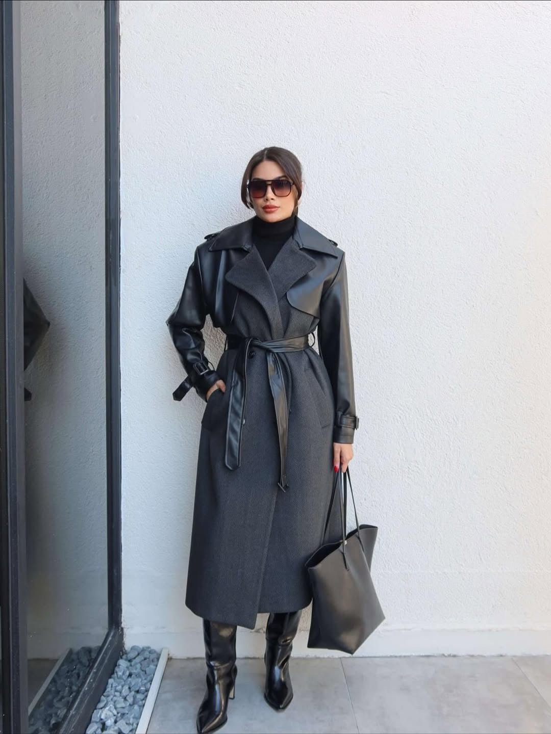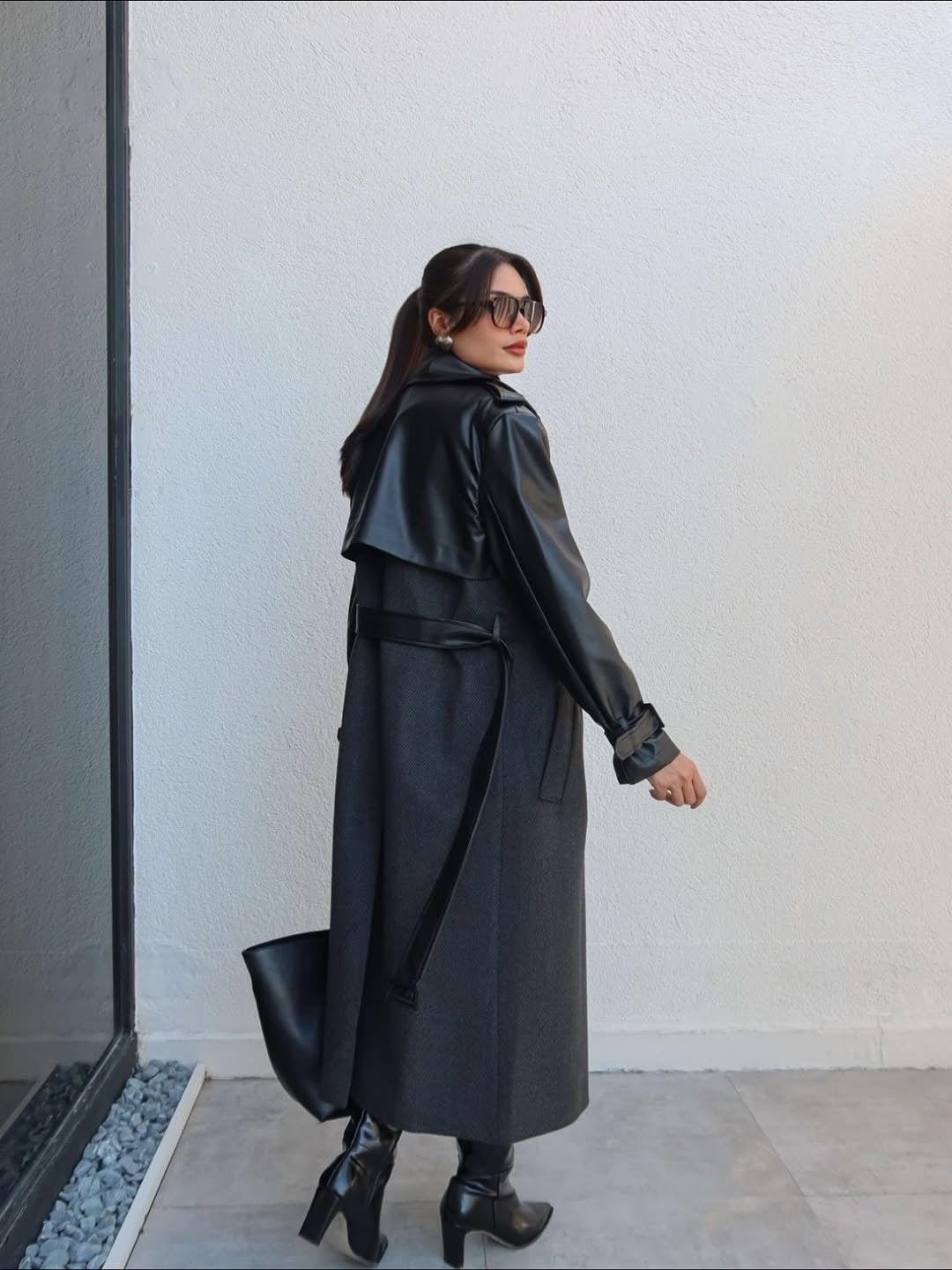 جكيت طويل بتصميم ترنش راقٍ، يجمع بين الاسود وقصّة جلدية عند الأكتاف والأكمام، ليعطي مظهراً فخماً وعصرياً بنفس الوقت.