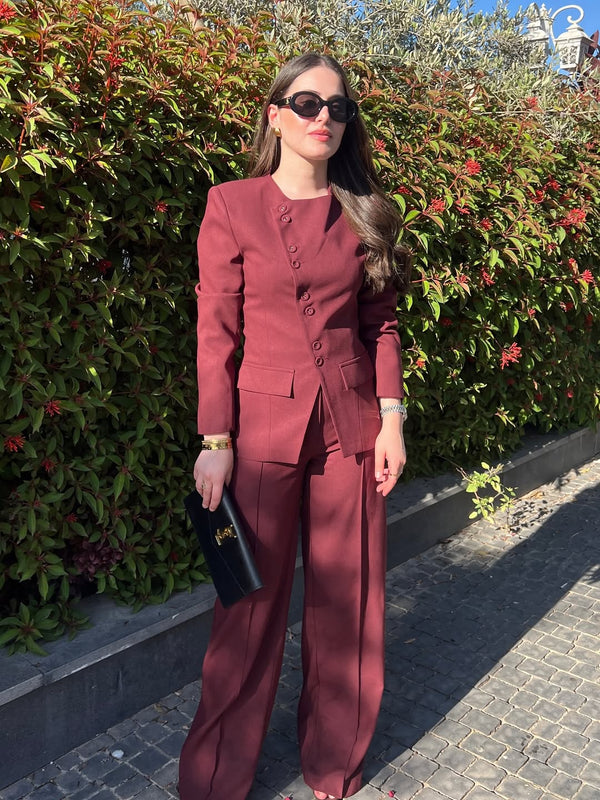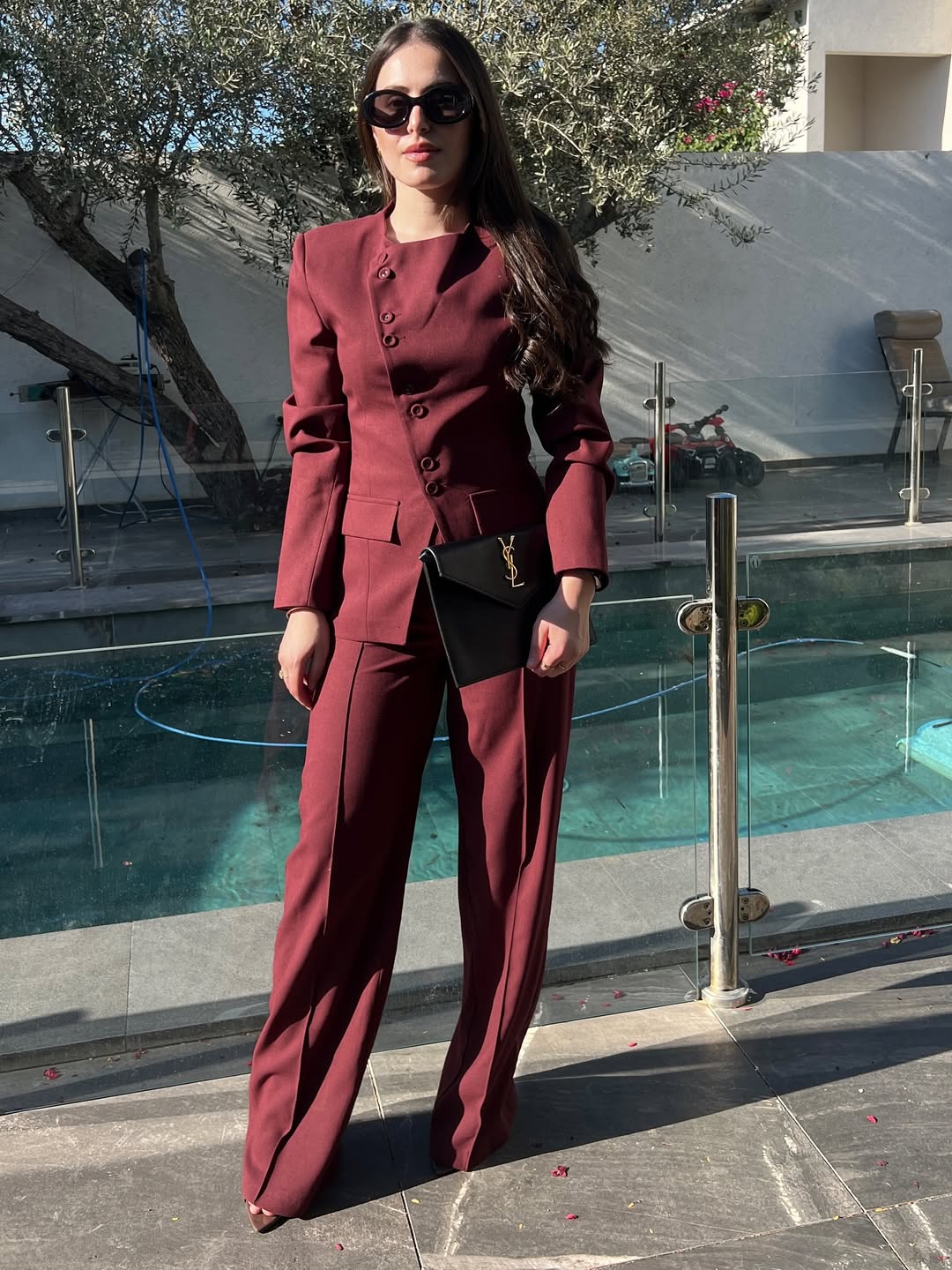 يأتي مع بنطال بقصّة مستقيمة تعكس حضوراً عملياً وأنثوياً في آن واحد.