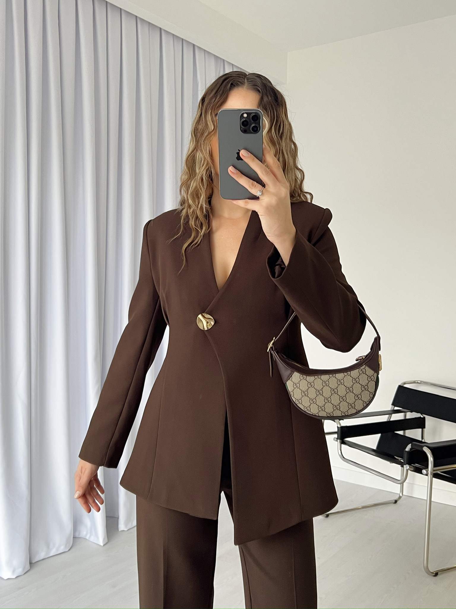 يأتي مع بنطال بقصّة مستقيمة تعكس حضوراً عملياً وأنثوياً في آن واحد.