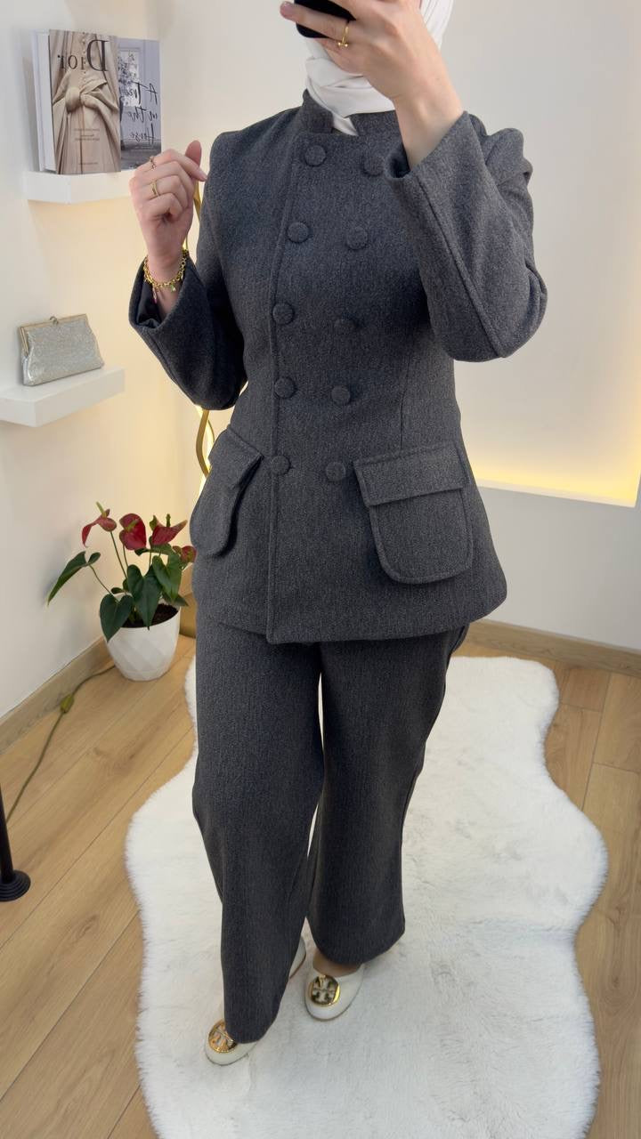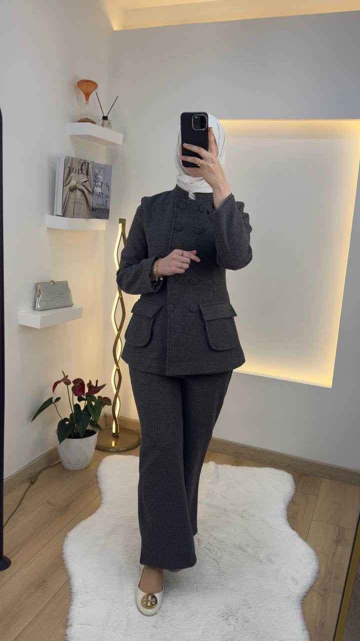 الجاكيت مزوّد بأزرار مكسوّة بنفس القماش لإطلالة راقية، مع جيوب أمامية تضيف لمسة عصرية وعملية.