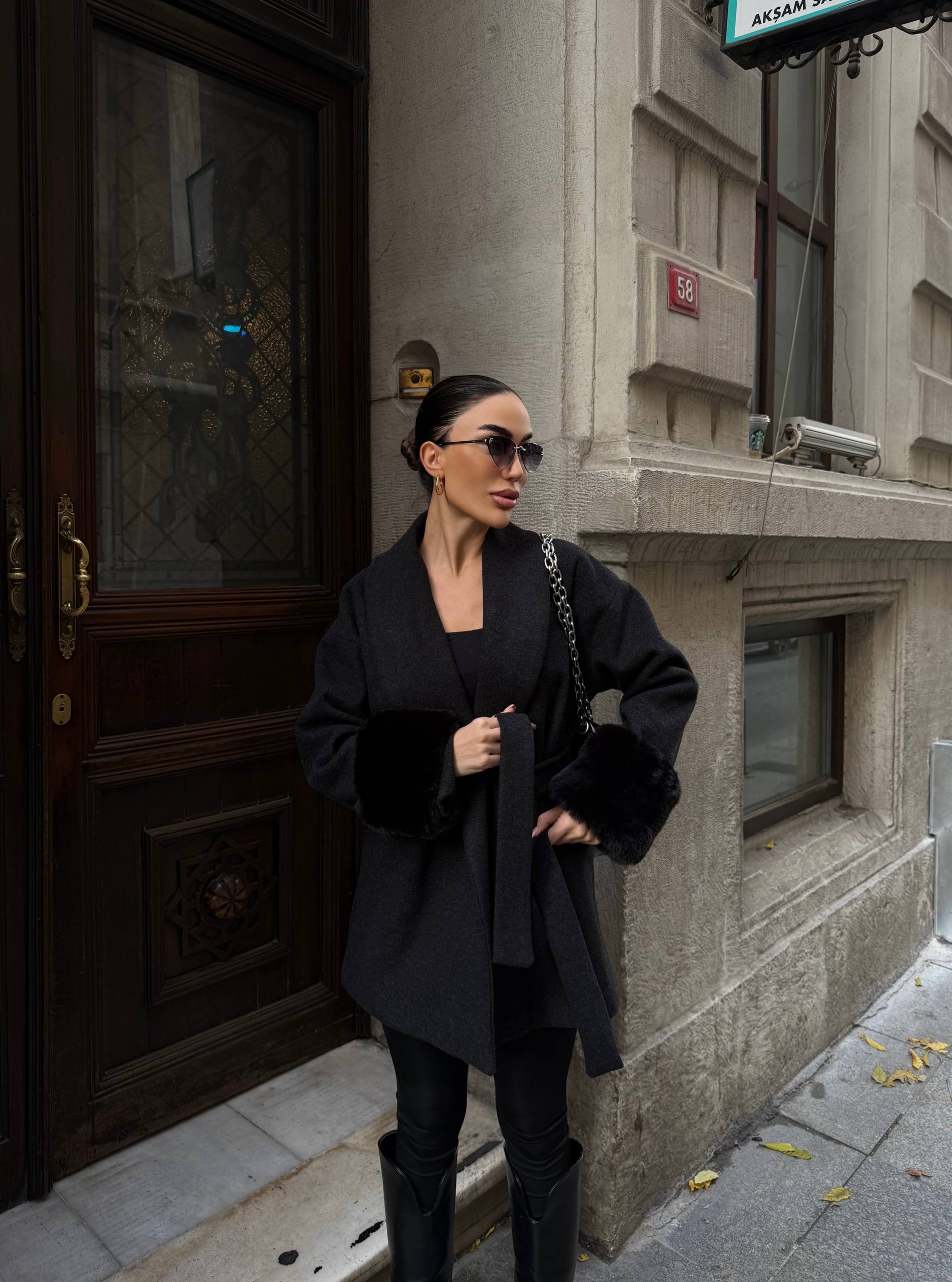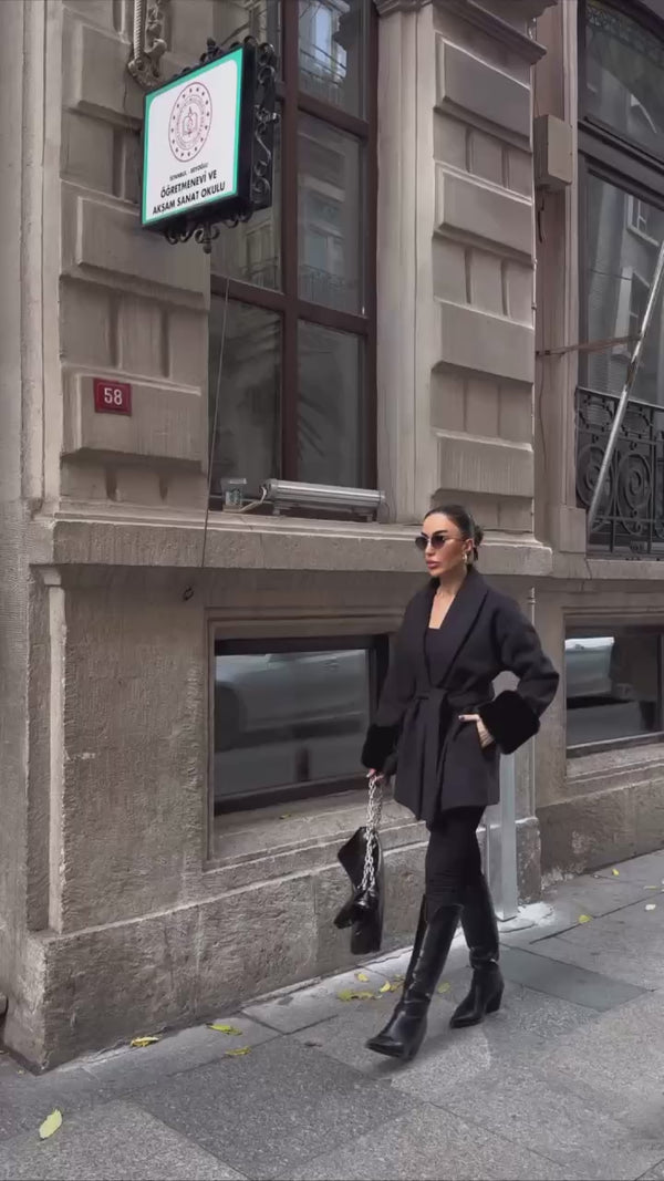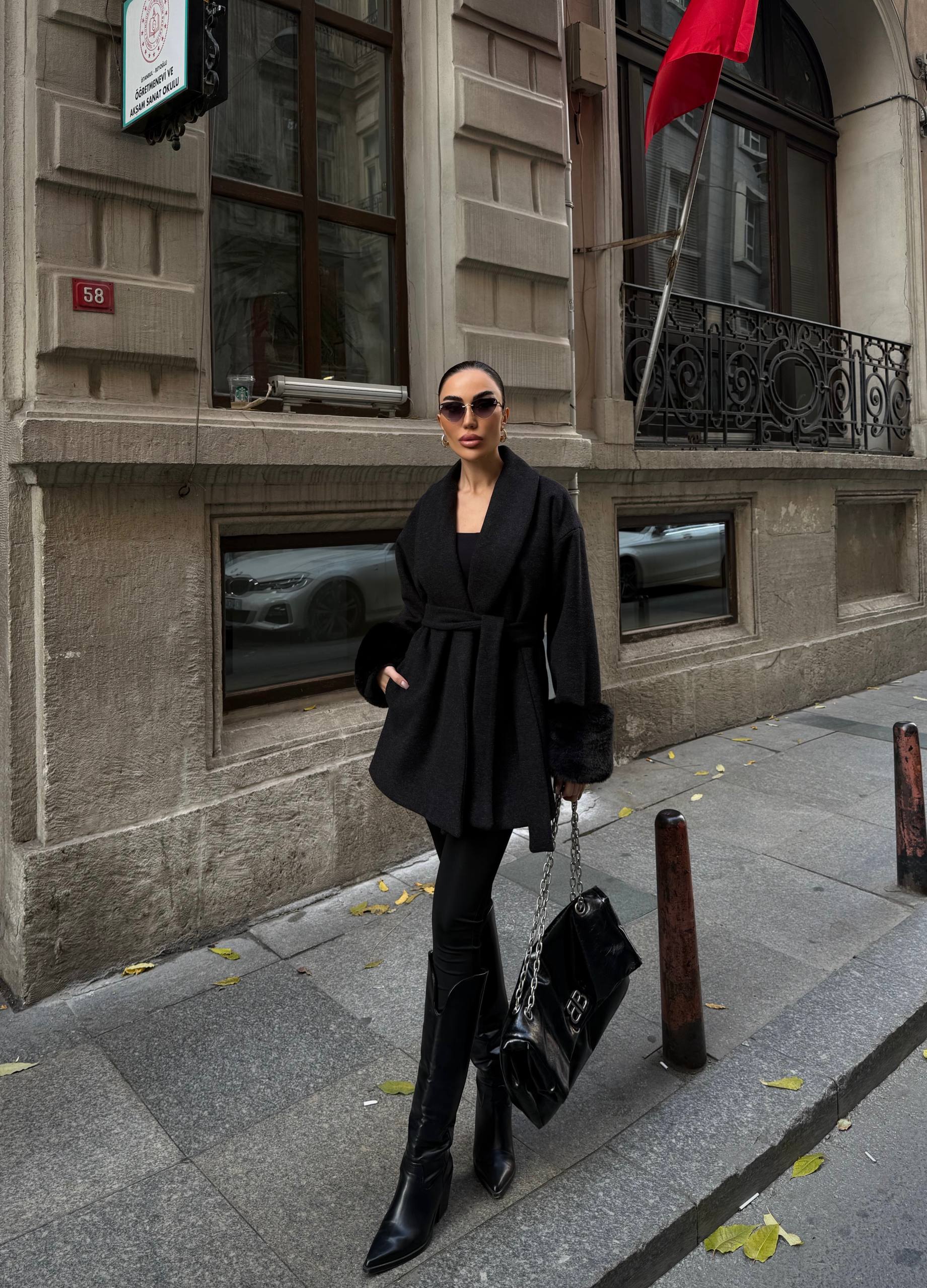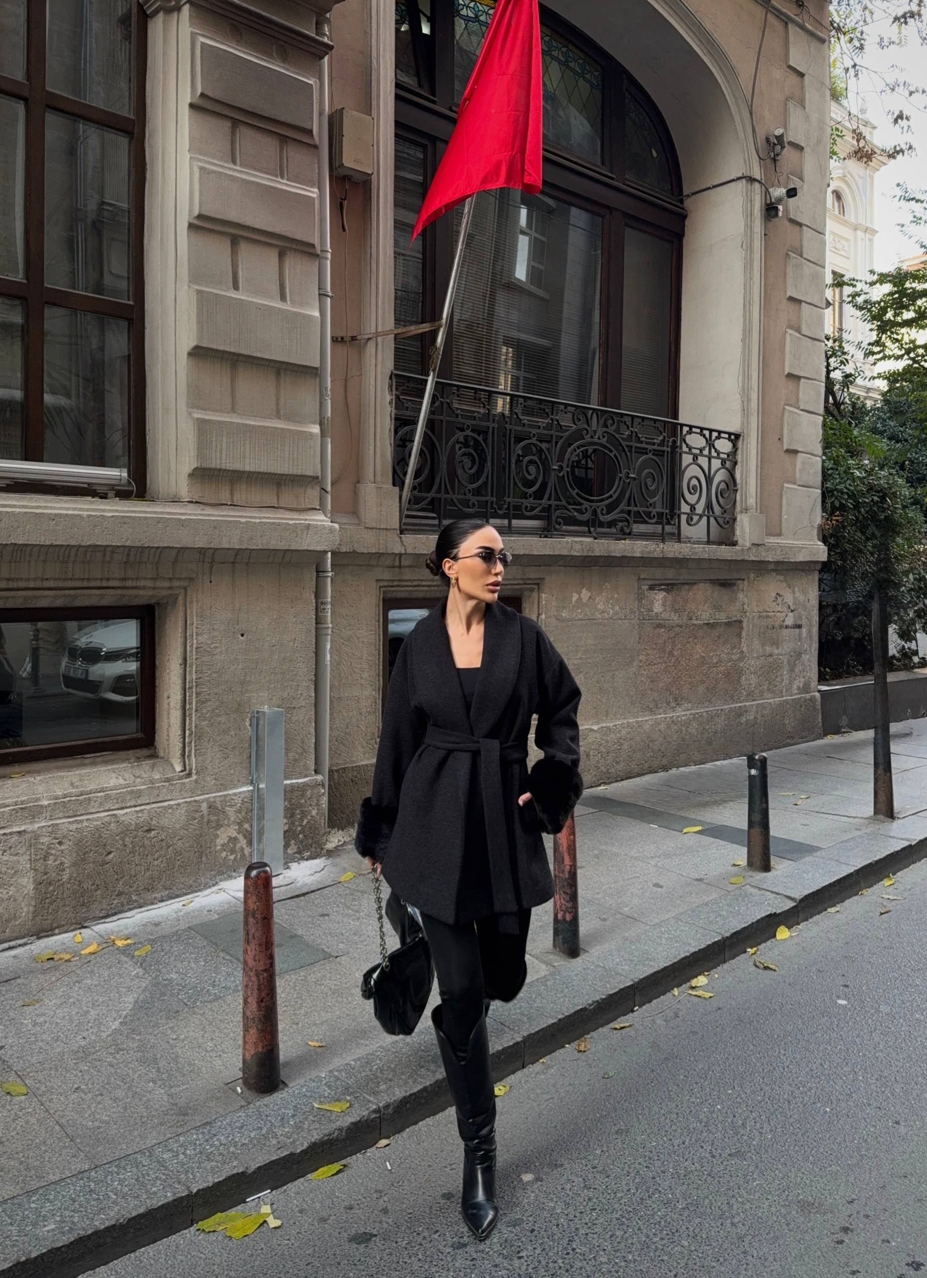 يأتي مع ربطة خصر تُبرز القوام، وأكمام مزينة بفراء ناعم يضيف لمسة رقي فورية لأي لوك.